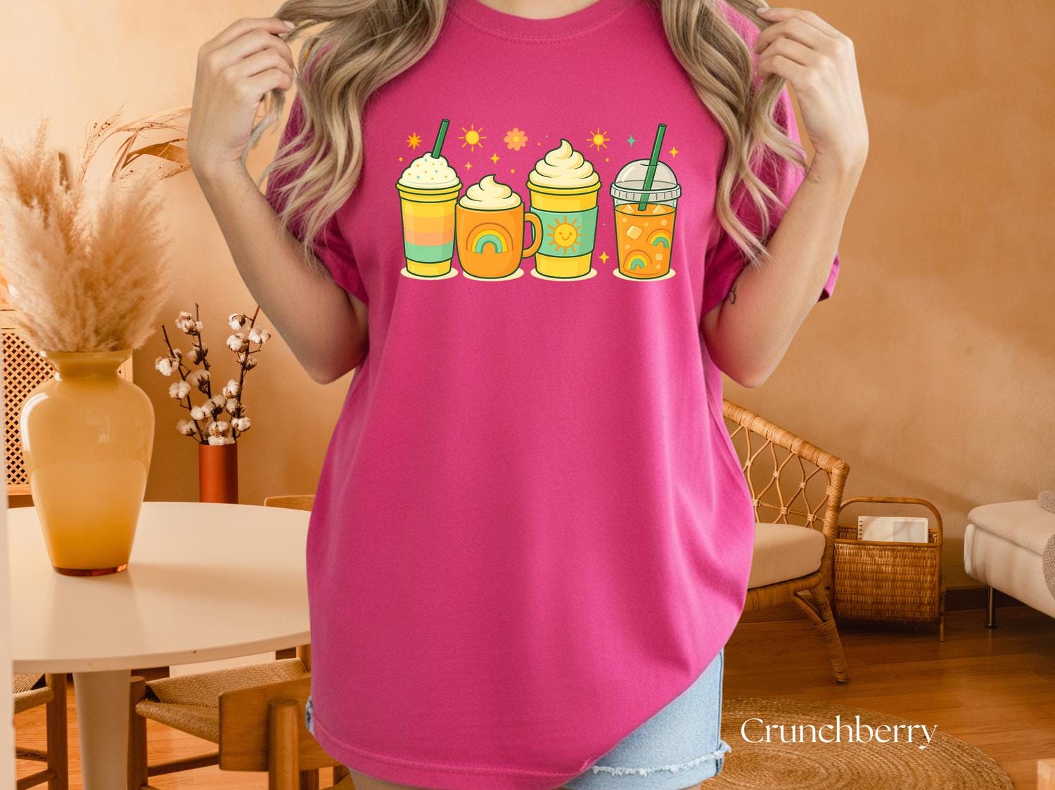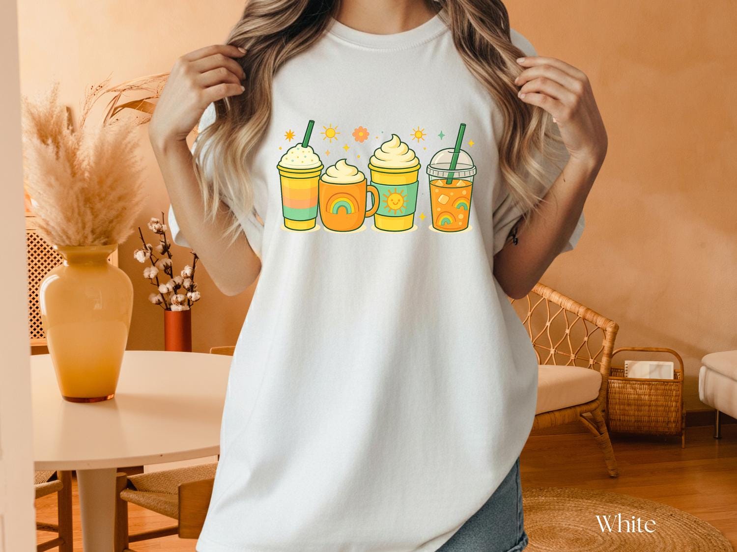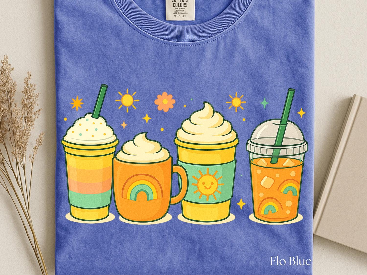 Celebrate your love of coffee and summer drinks with this adorable Coffee Lovers Tee! Featuring a cheerful lineup of illustrated beverages—frothy frappuccinos, cozy mugs, bright iced teas, and bubble teas—this kawaii summer beverage tee is perfect for coffee enthusiasts, bubble tea lovers, and anyone who enjoys a fun, casual style. Crafted from soft, garment-dyed medium-weight cotton, it offers a comfortable, lived-in feel from the very first wear. Whether you're lounging at home, running errands, or catching up with friends, this cute graphic tee makes a delightful addition to your wardrobe or a thoughtful gift for the coffee lover in your life.