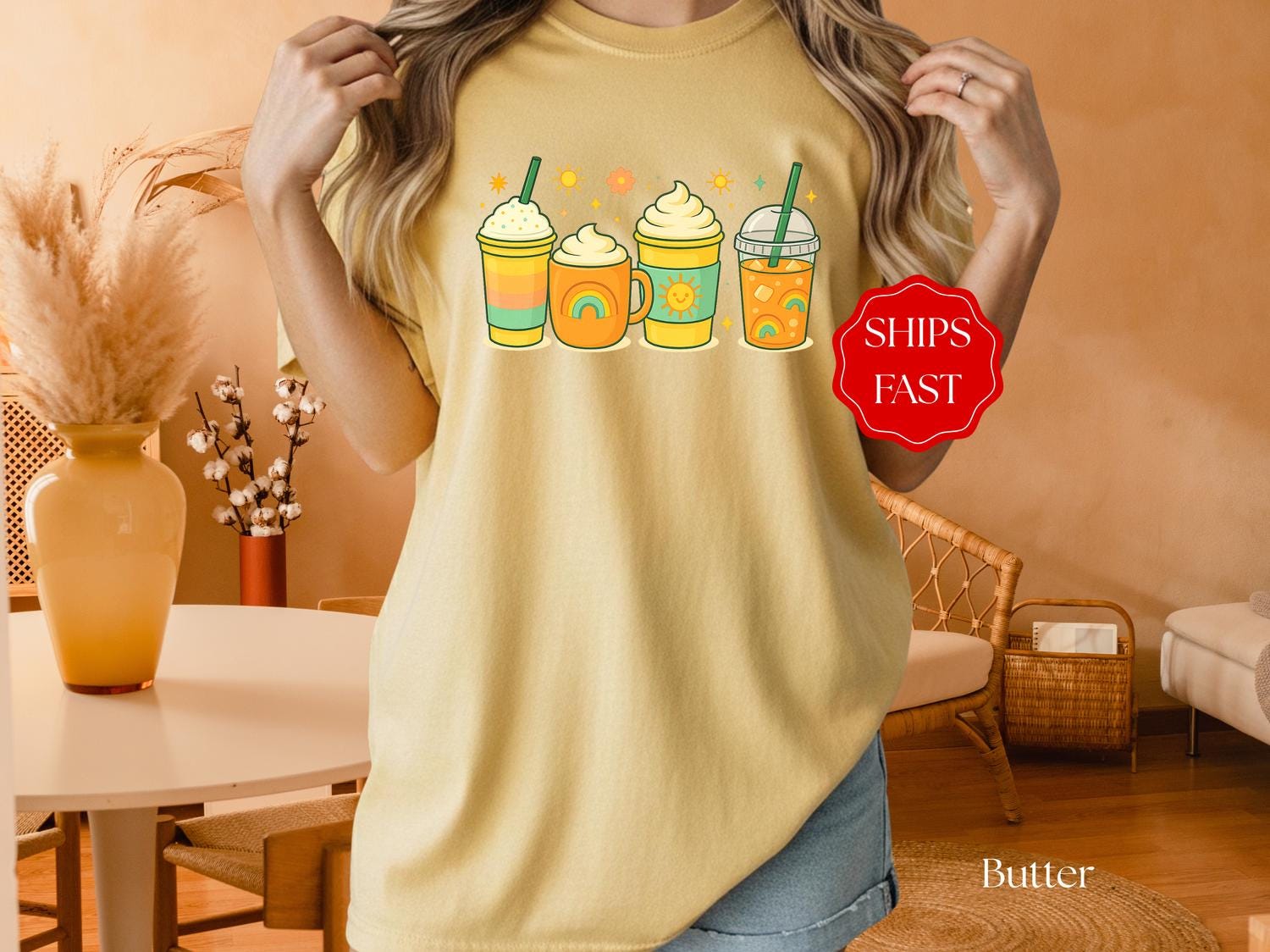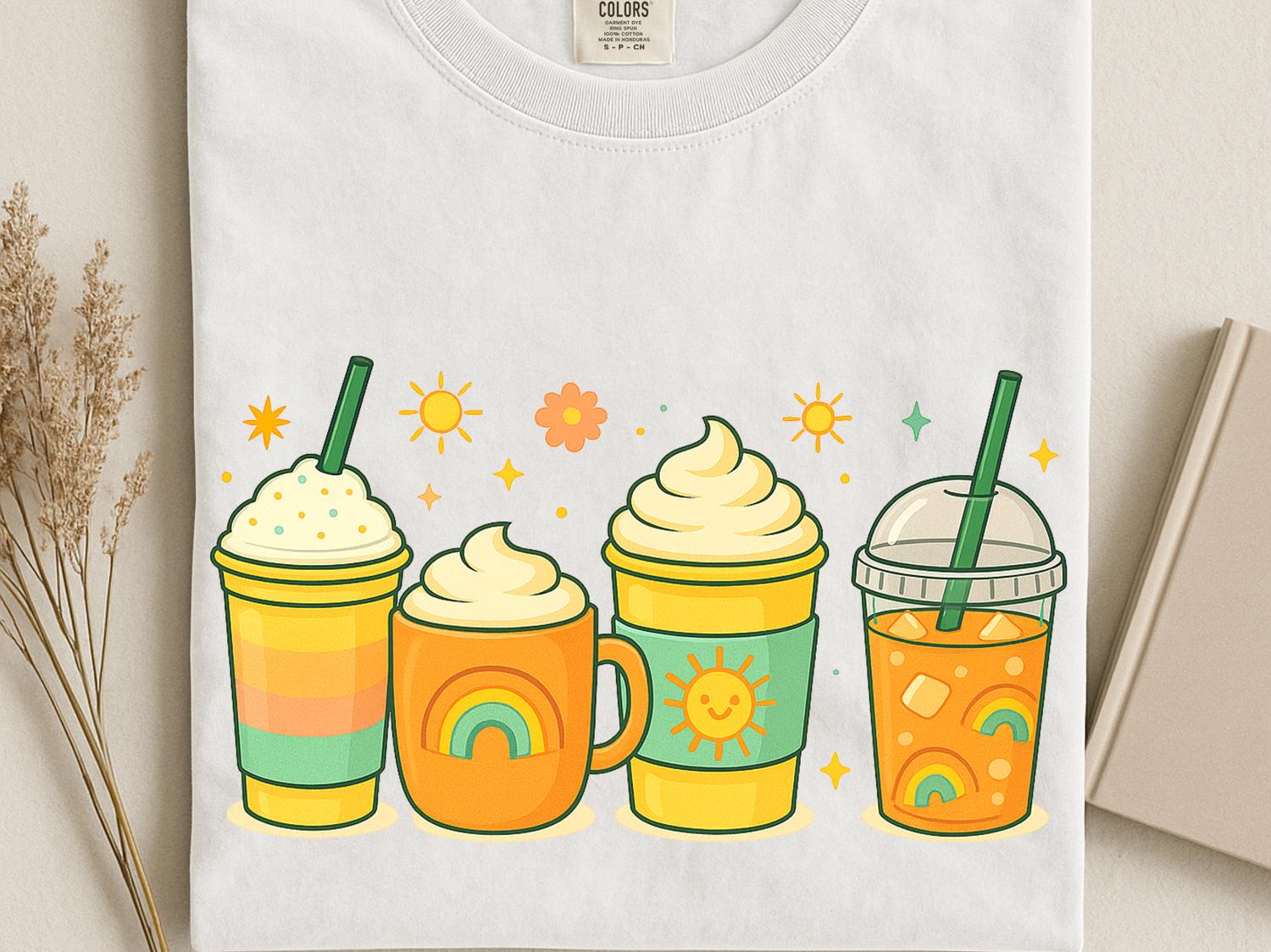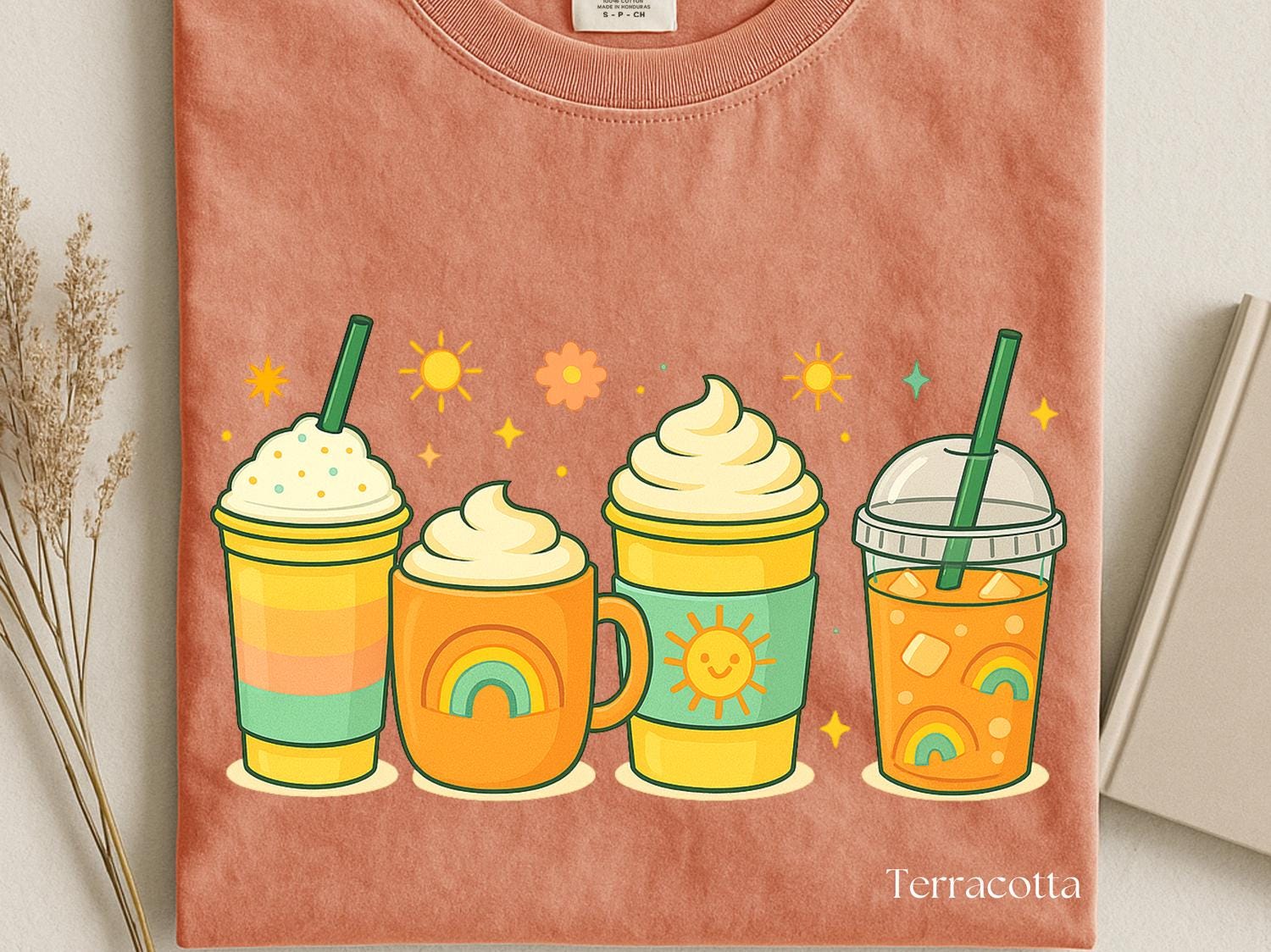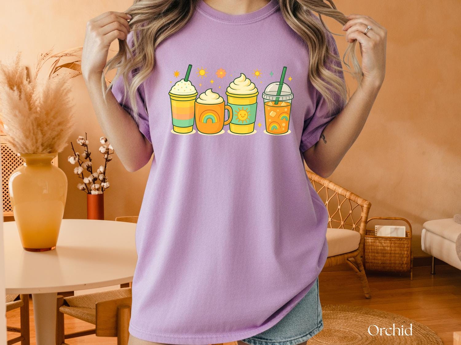 Celebrate your love of coffee and summer drinks with this adorable Coffee Lovers Tee! Featuring a cheerful lineup of illustrated beverages—frothy frappuccinos, cozy mugs, bright iced teas, and bubble teas—this kawaii summer beverage tee is perfect for coffee enthusiasts, bubble tea lovers, and anyone who enjoys a fun, casual style. Crafted from soft, garment-dyed medium-weight cotton, it offers a comfortable, lived-in feel from the very first wear. Whether you're lounging at home, running errands, or catching up with friends, this cute graphic tee makes a delightful addition to your wardrobe or a thoughtful gift for the coffee lover in your life.