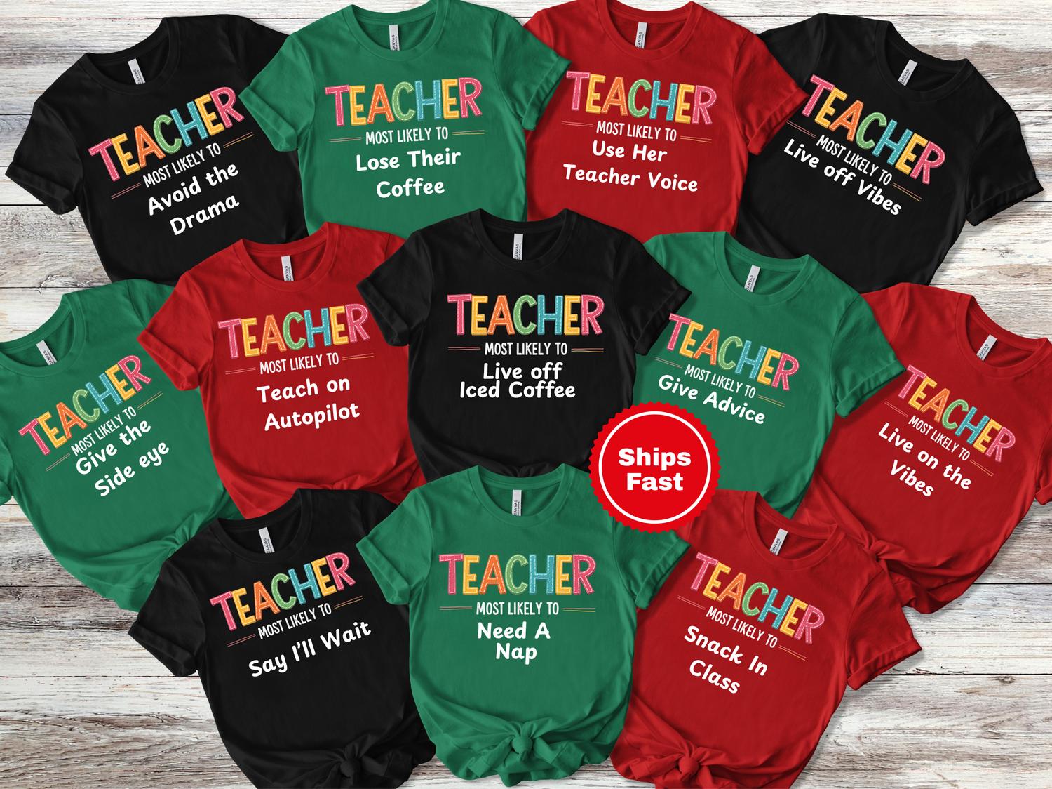 Each shirt features playful sayings like "Most Likely to Live Off Iced Coffee," "Most Likely to Use Her Teacher Voice," and "Most Likely to Teach on Autopilot," making them ideal for teachers, friends, or team members. Crafted from comfortable, high-quality materials, these personalized tees are perfect for casual wear, school events, or classroom celebrations. They also make thoughtful gifts for teachers who deserve recognition and appreciation.
