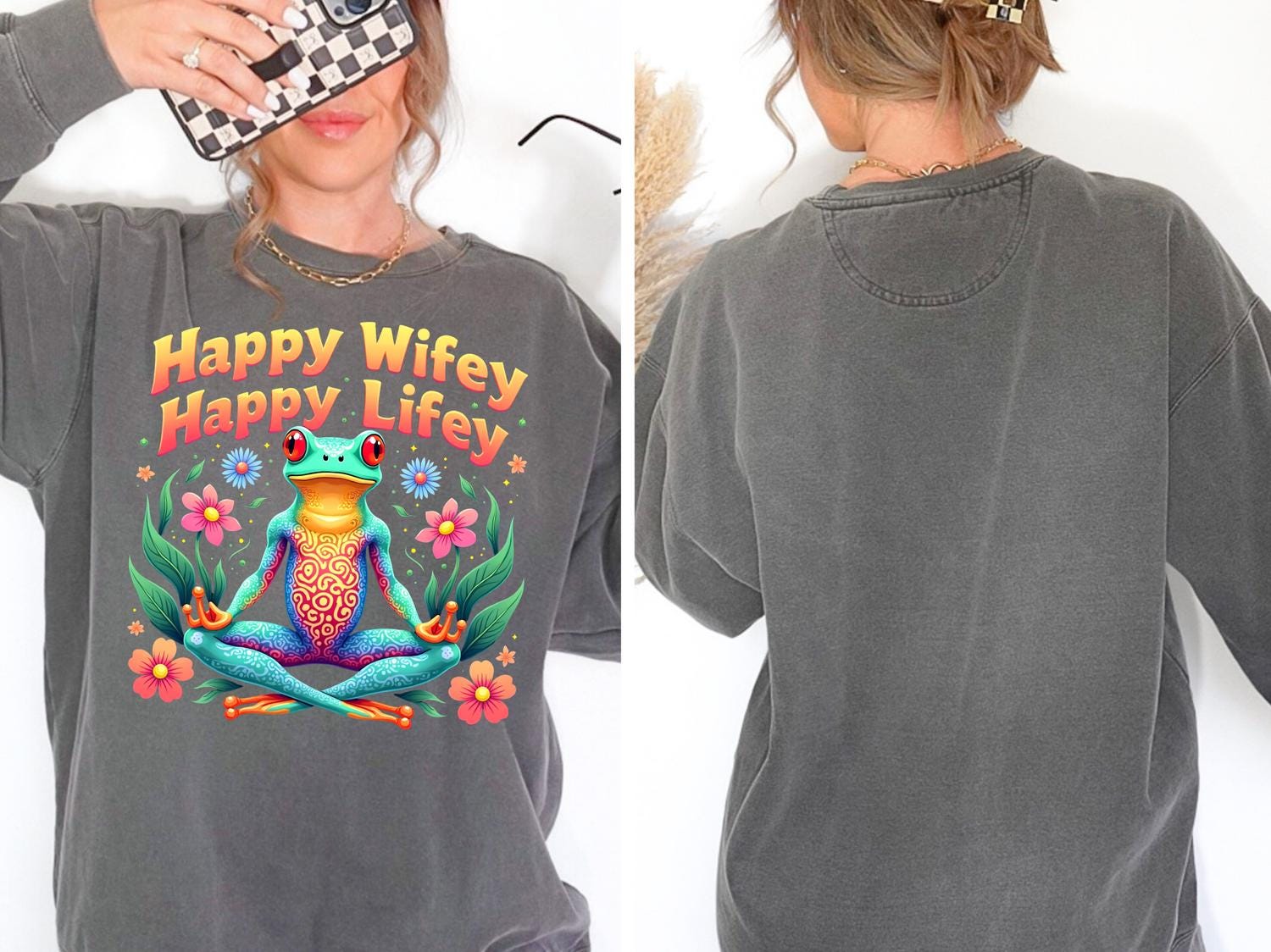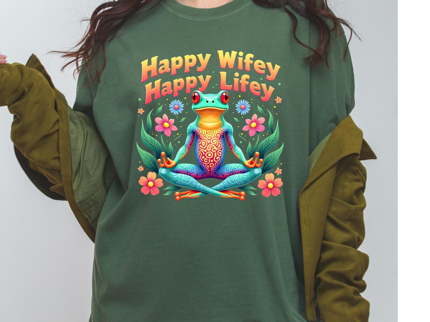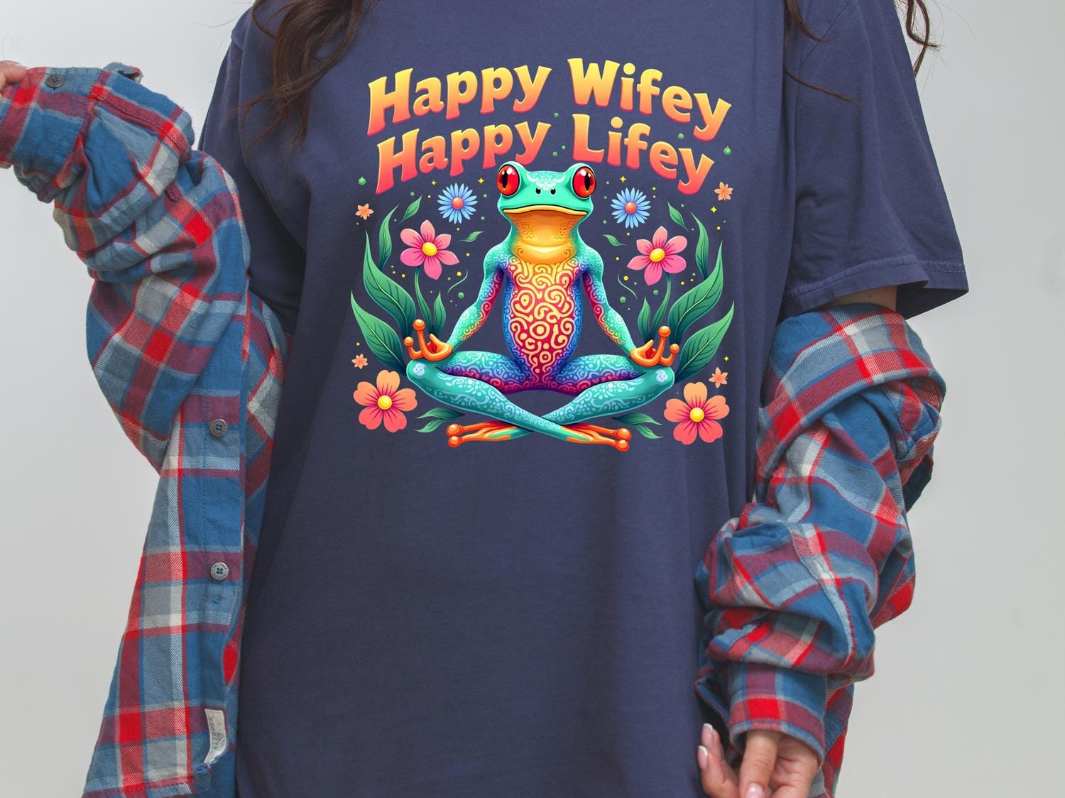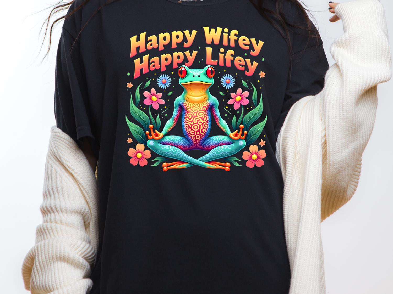 - Vibrant frog and floral graphic with playful "Happy Wifey Happy Lifey" message