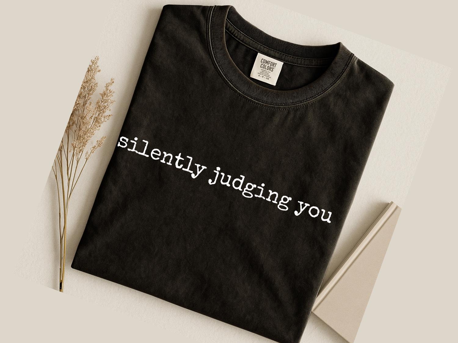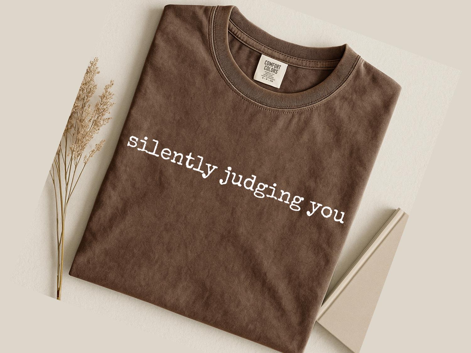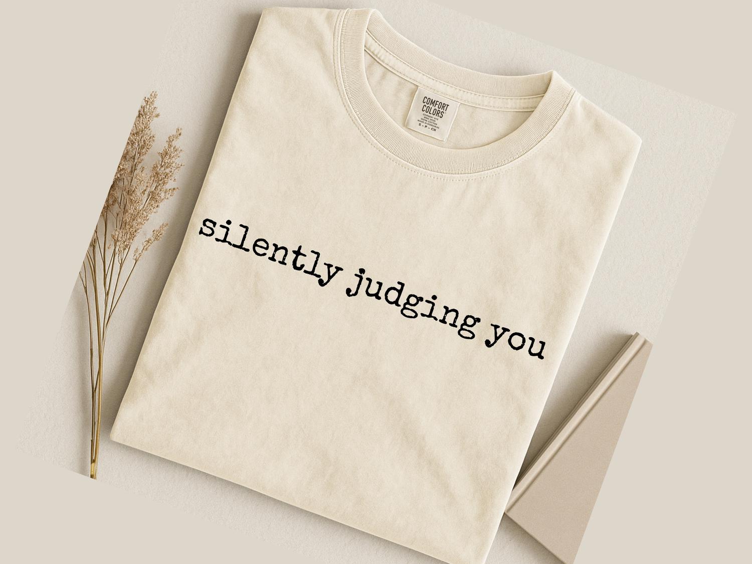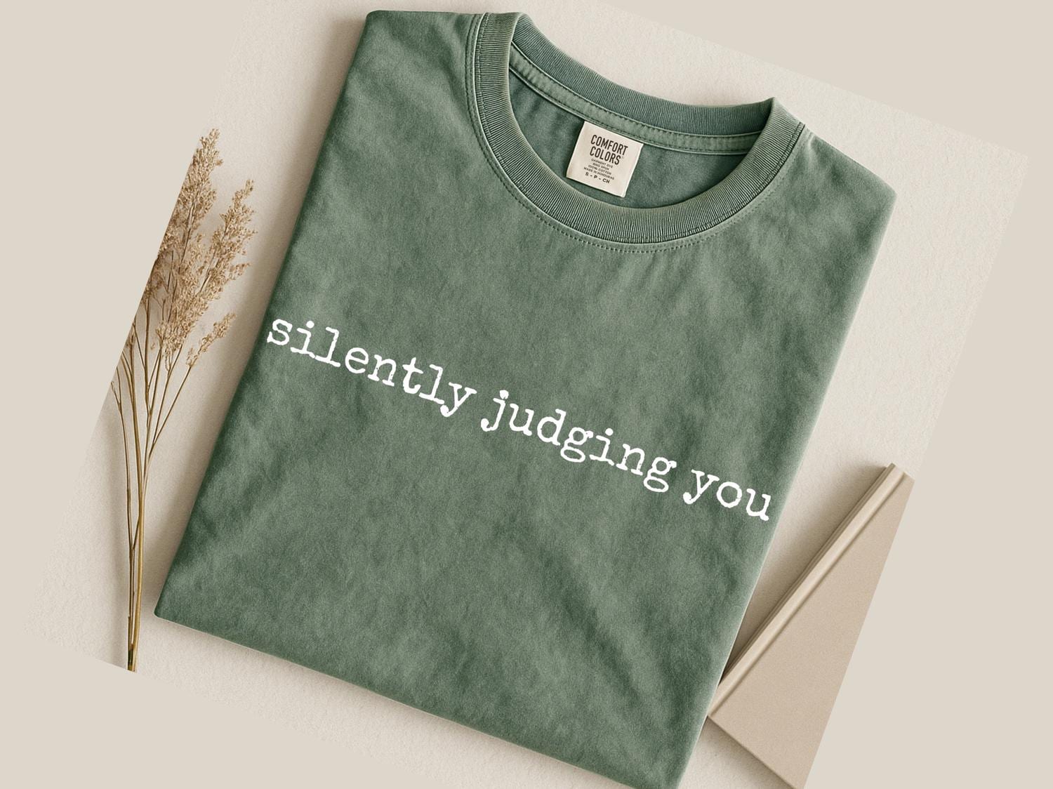 Express your witty side with our Meme Inspired Shirt, featuring the hilarious "Silently Judging You" funny humor shirt design. Crafted from high-quality Comfort Colors® fabric, this sarcastic sweatshirt offers the perfect blend of humor and comfort for everyday wear. Whether you're out with friends, attending a casual gathering, or searching for a fun gift, this funny shirt is guaranteed to spark smiles and conversations.