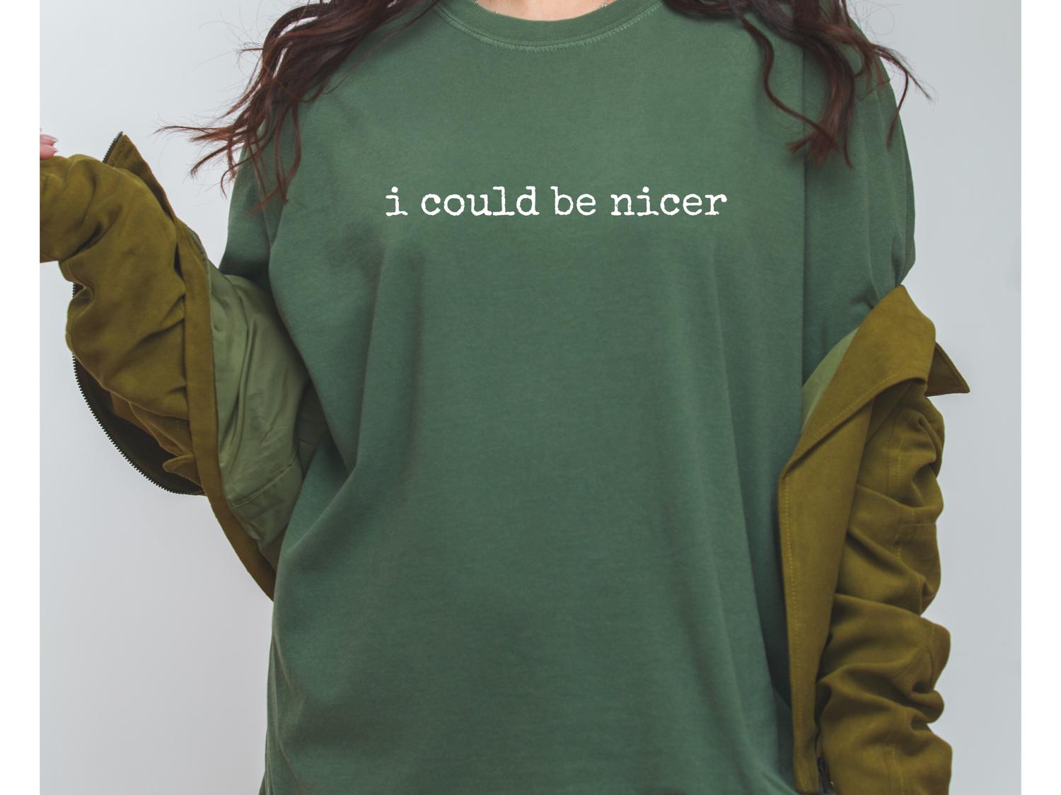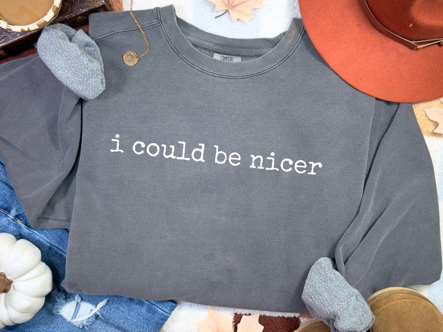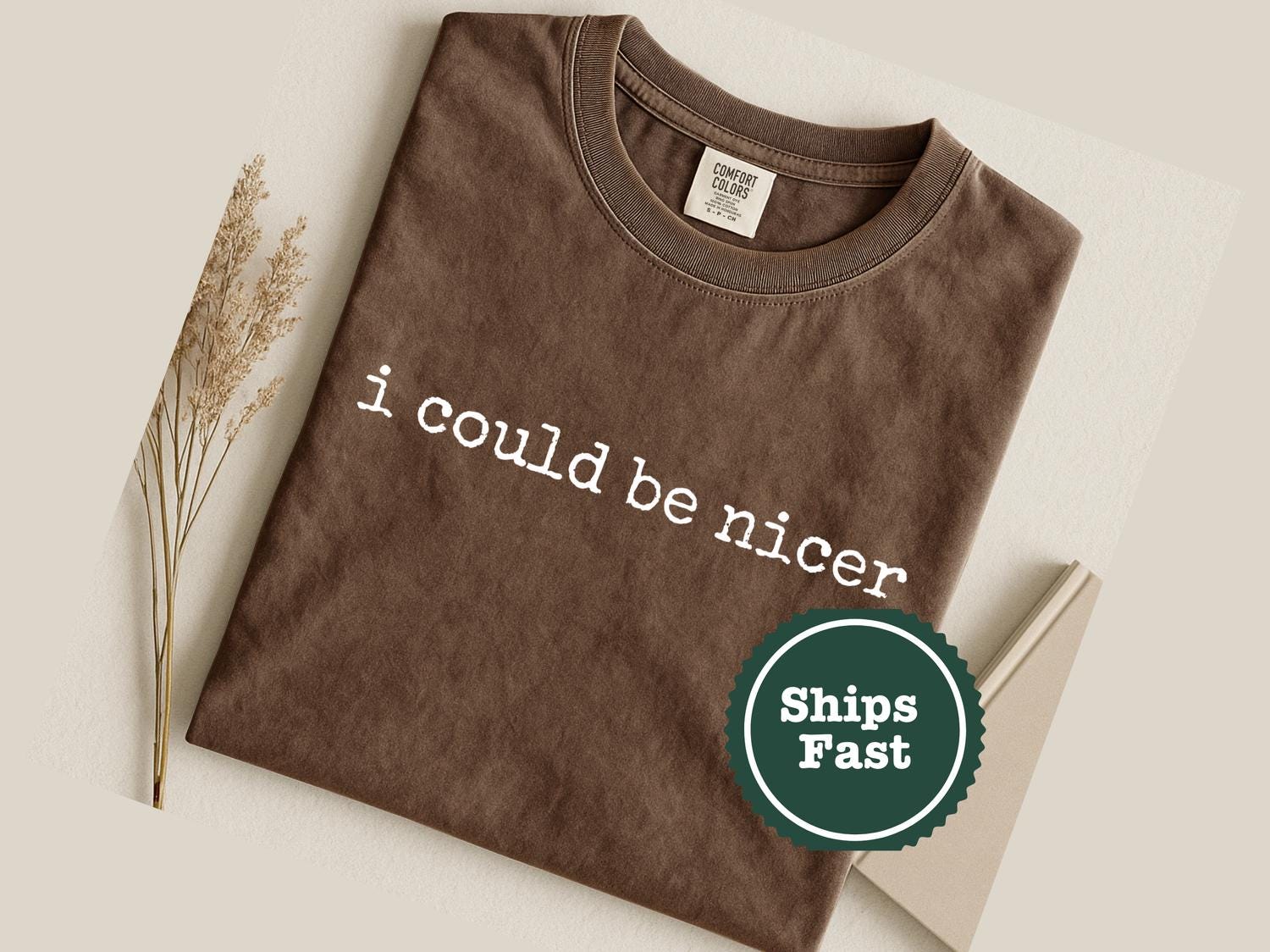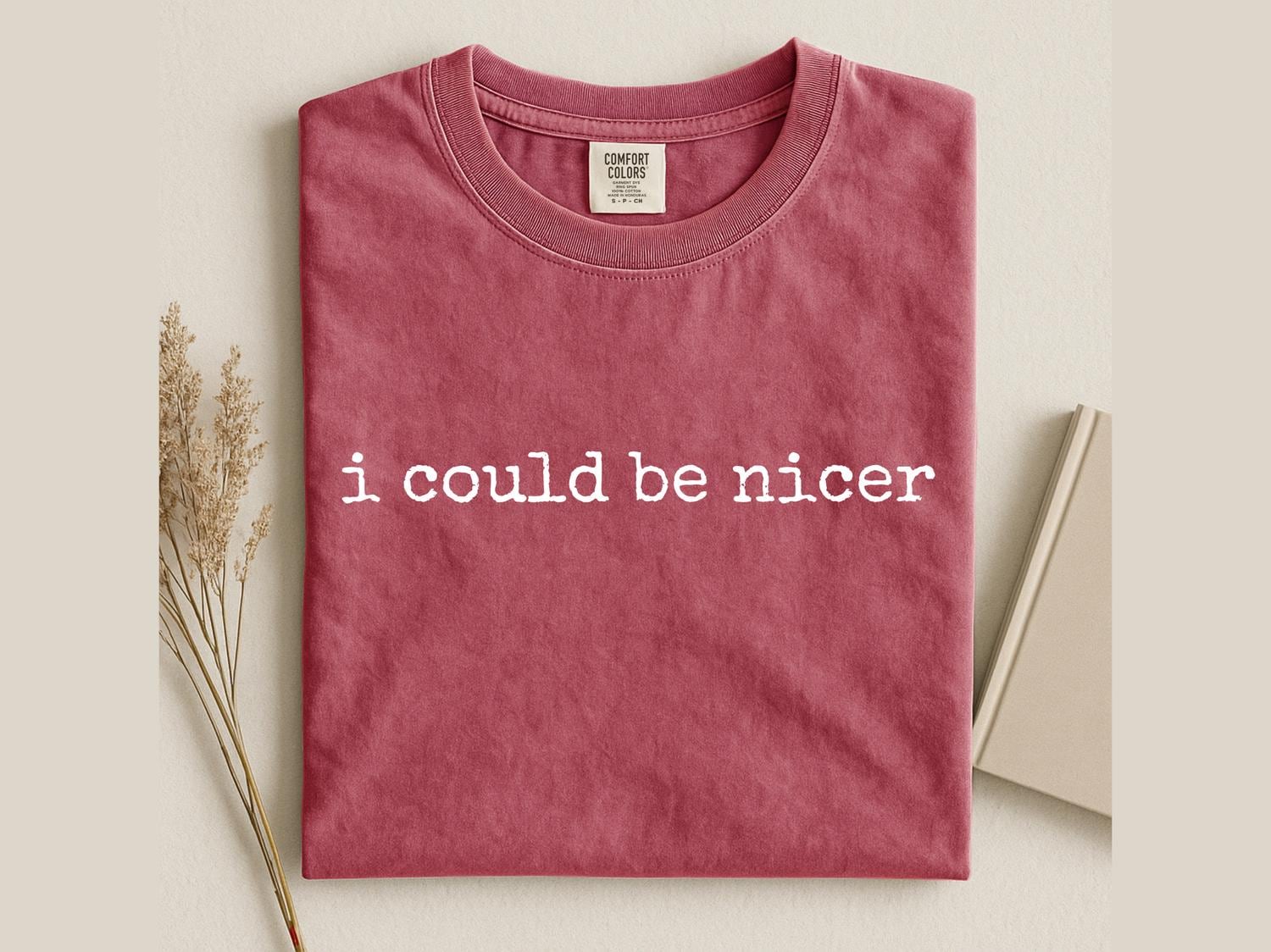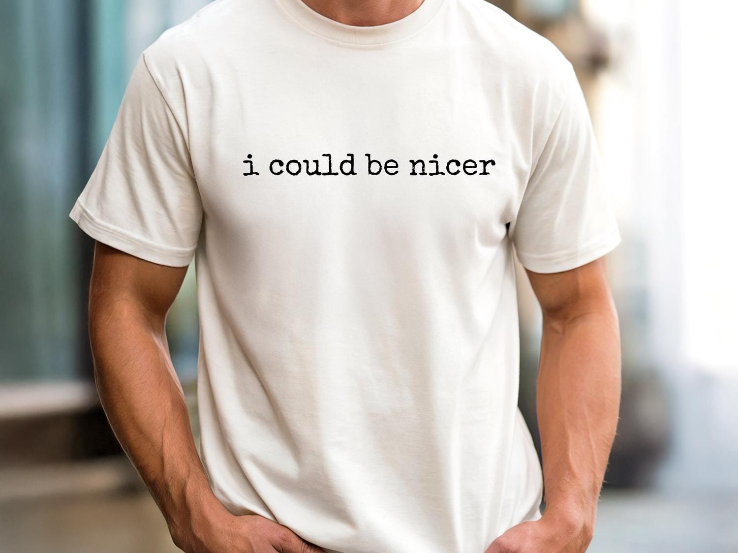 Made from soft, comfortable materials, this trendy shirt ensures you stay cozy while making a bold statement. Its versatile style pairs effortlessly with jeans, leggings, or shorts, making it suitable for any casual occasion. The eye-catching design features the phrase "I could be nicer" in a playful, minimalist font, adding a touch of humor to your wardrobe.