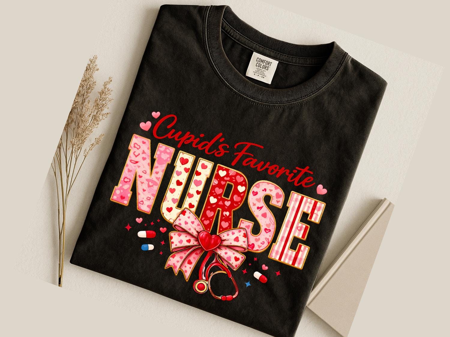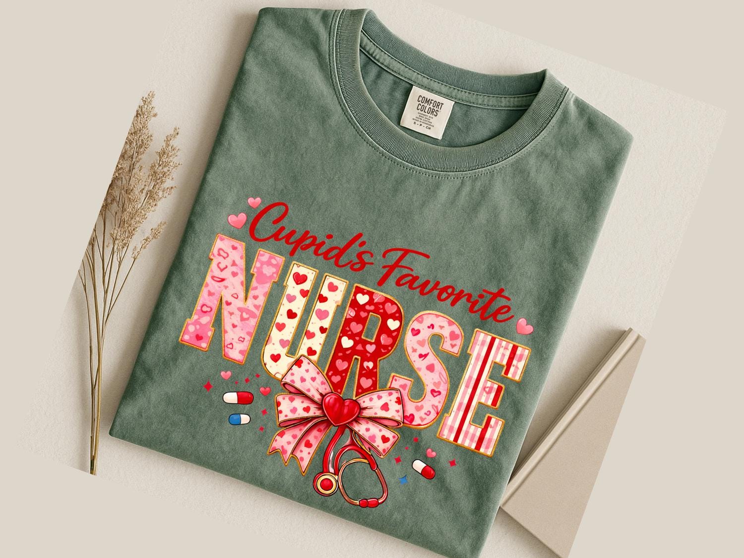 - Features a heartwarming "Cupid’s Favorite Nurse" design with hearts, bows, and heartbeat graphic