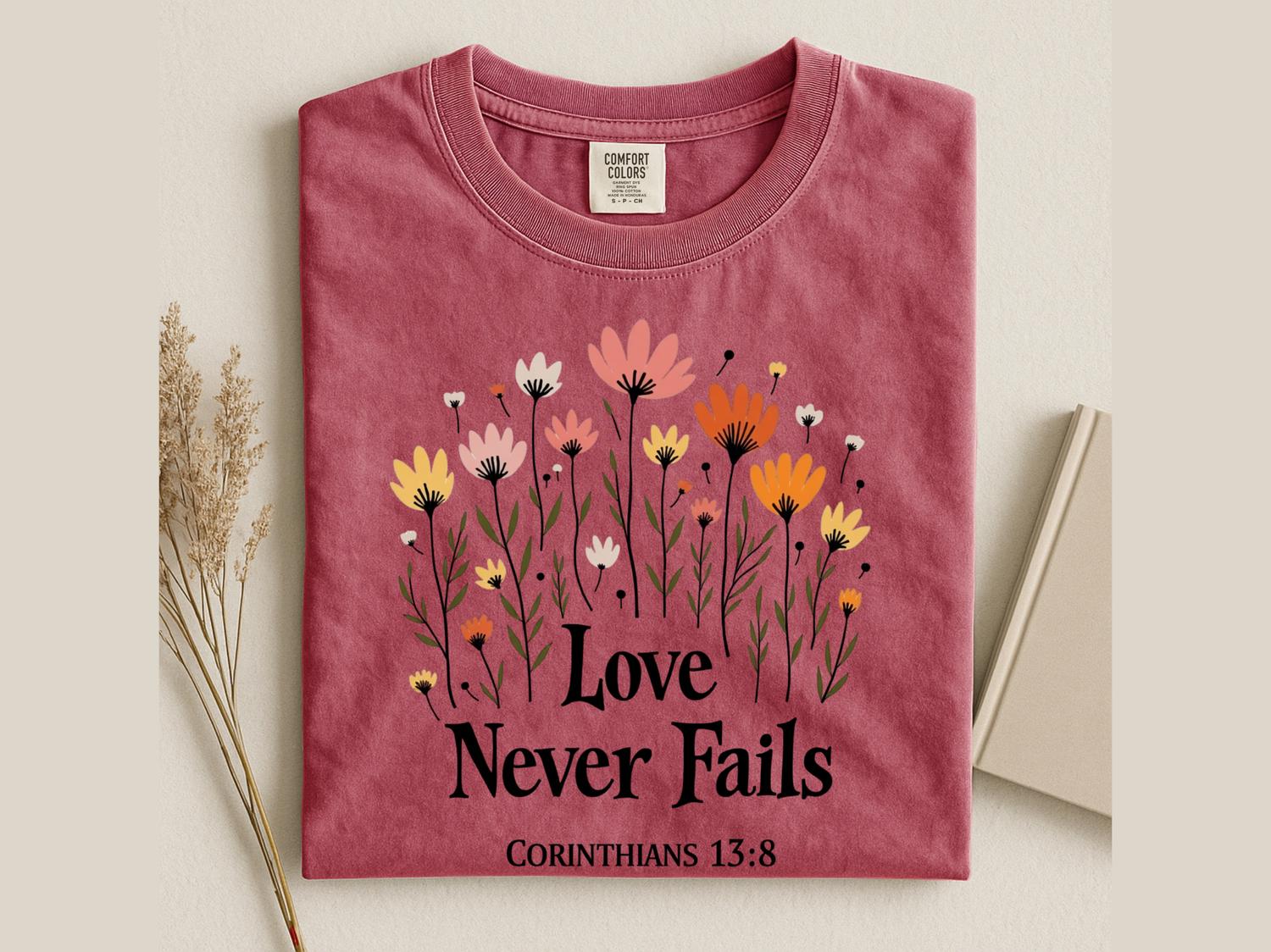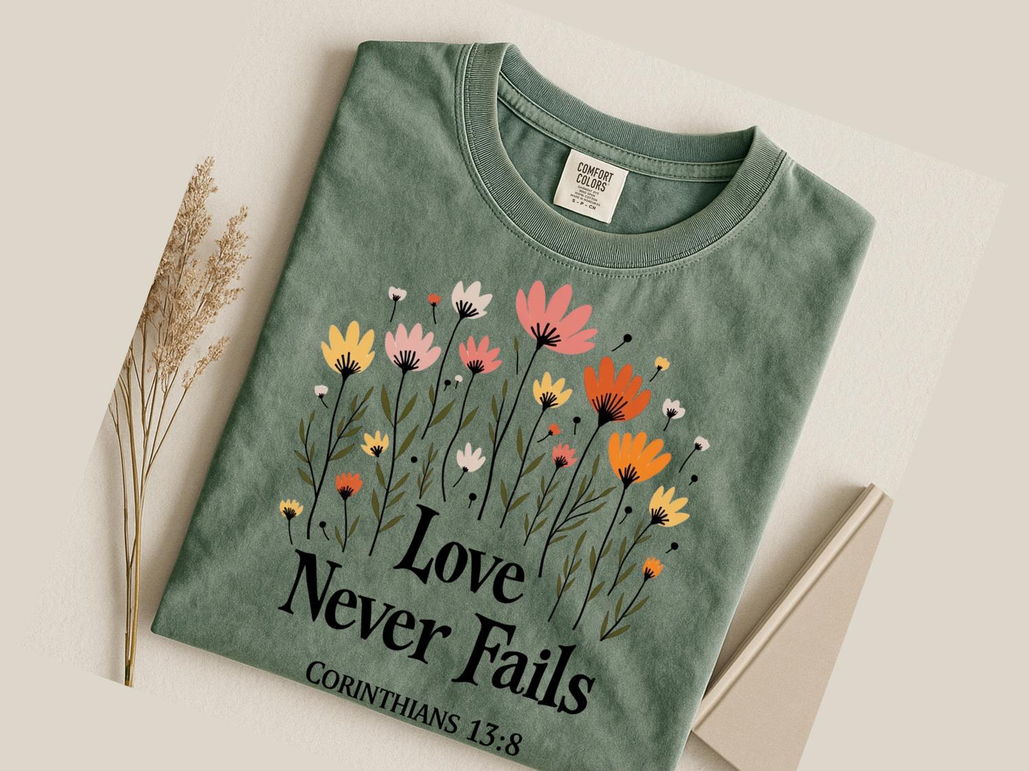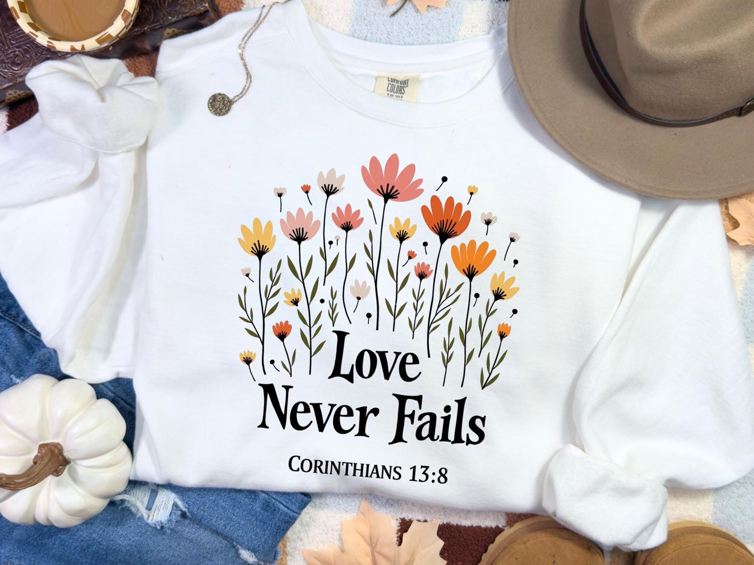 Christian Jesus Sweatshirt, Love Never Fails Bible Verse T-Shirt, Faith Apparel Gift, Religious Tee, Christian Love Shirt, Comfort Colors