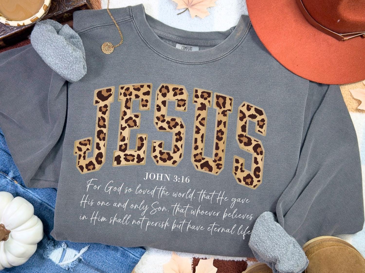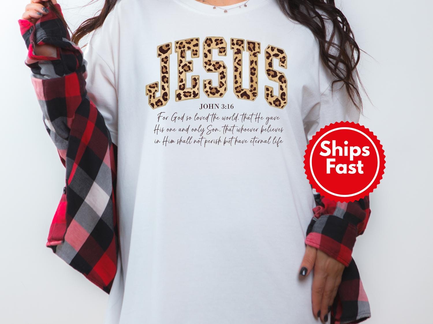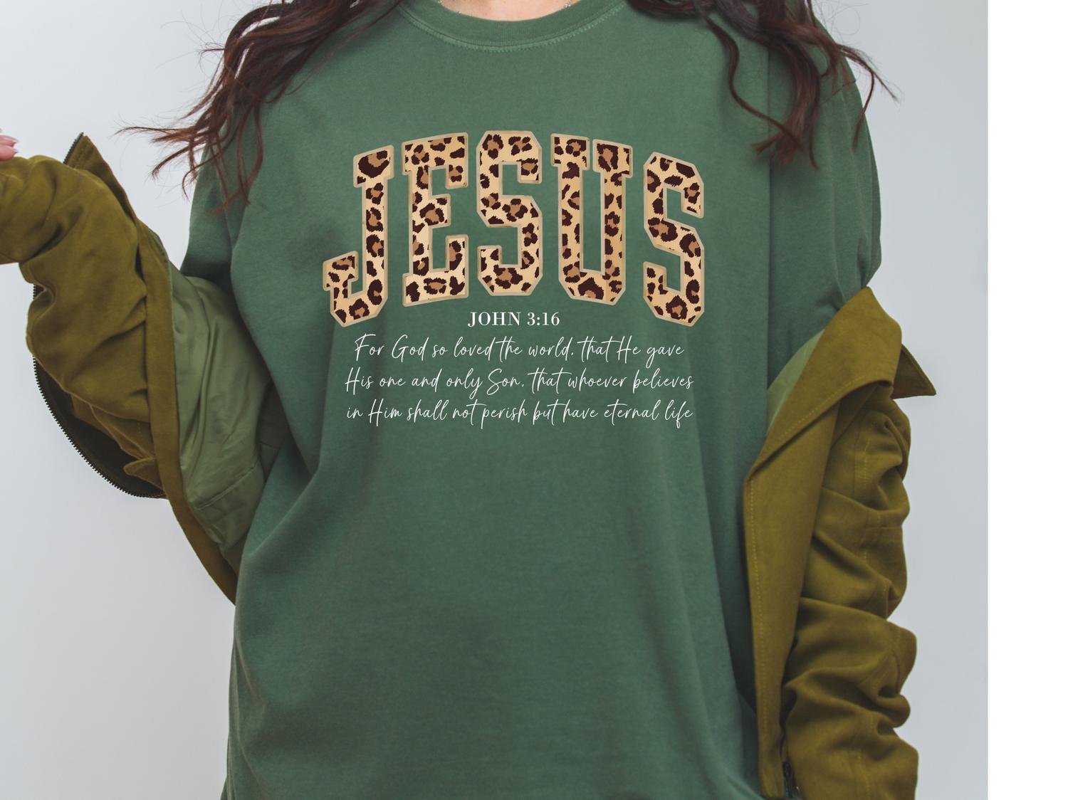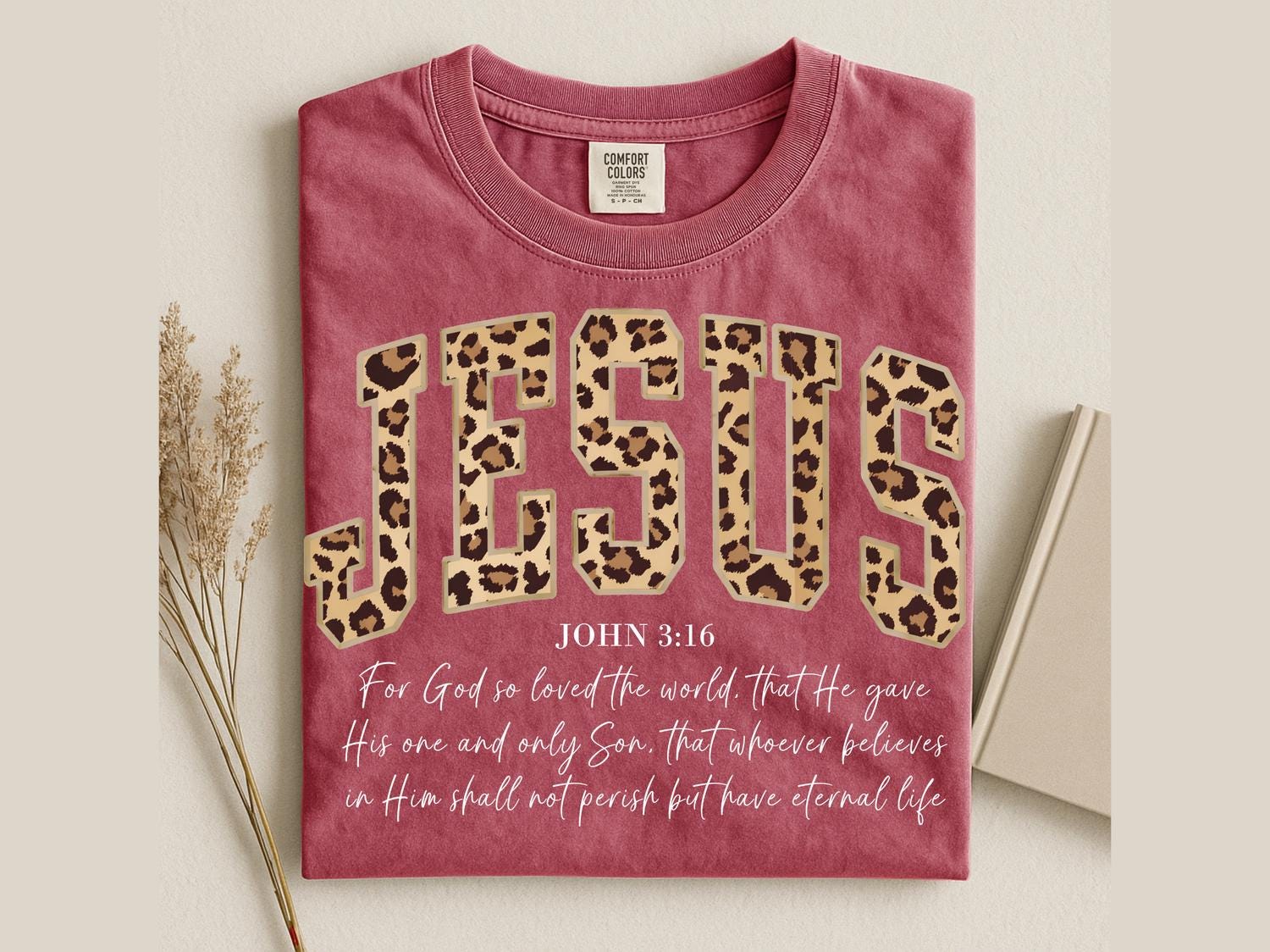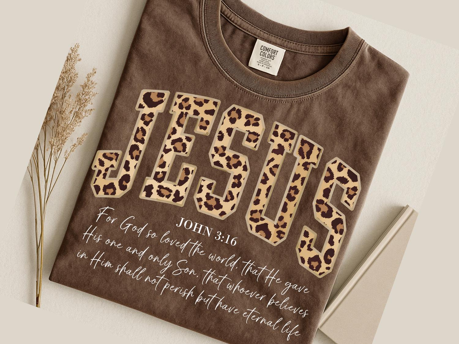 Designed with a bold leopard print spelling out "JESUS" and featuring the powerful Bible verse John 3:16 underneath, this shirt beautifully combines style, faith, and personality. Its eye-catching design makes a confident statement about your beliefs while adding a touch of fun and flair to your wardrobe.