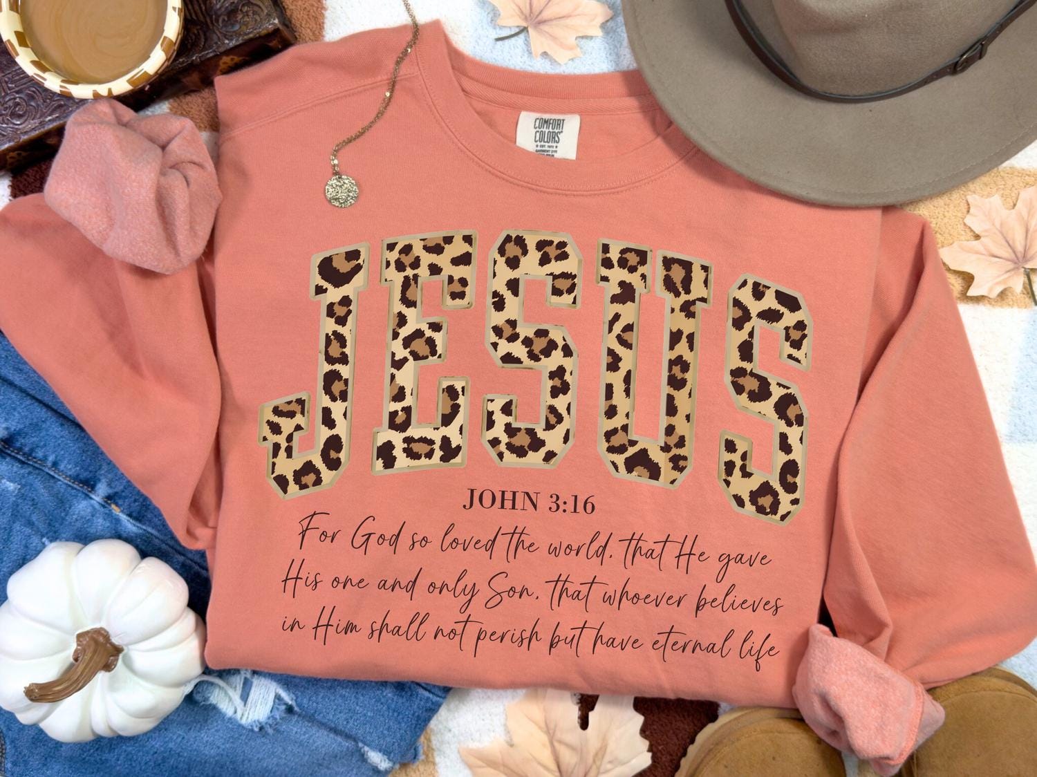 Celebrate your faith and showcase your love for Jesus with this inspiring Jesus Leopard Print 3:16 Shirt, perfect for Christian moms and believers alike. Crafted from high-quality Comfort Colors fabric, this religious faith tee offers exceptional comfort and durability, making it an ideal choice for church gatherings, family events, or everyday wear.