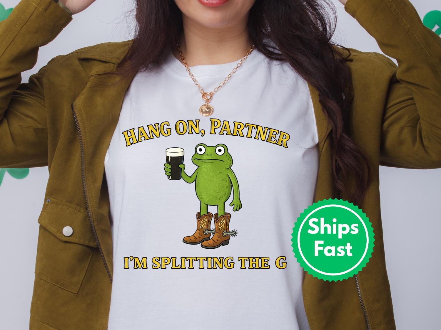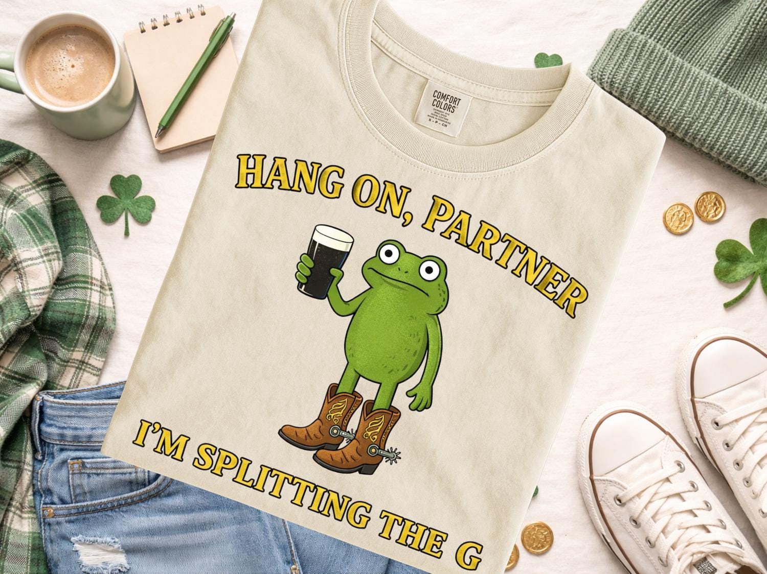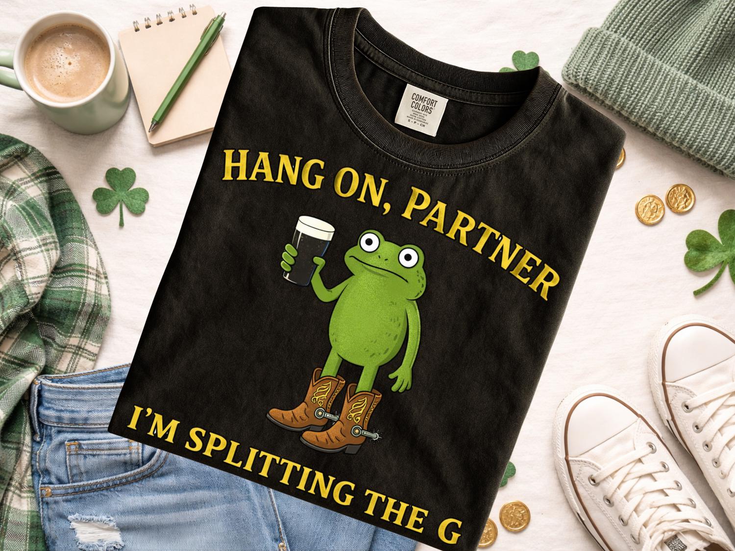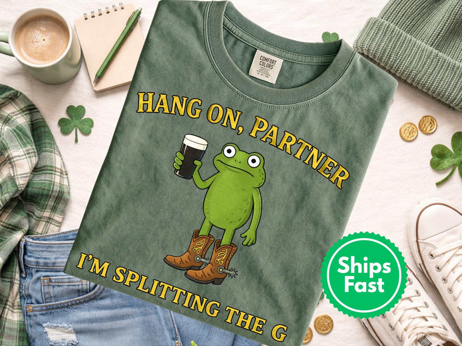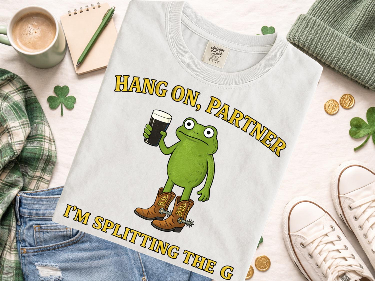 Celebrate St Patrick’s Day in style with this fun and festive Splitting the G St Patrick’s Day Shirt, perfect for embracing Irish spirit and spreading cheer! Featuring a playful design of a green frok character wearing boots and holding a pint, along with the humorous phrase "Hang on, Partner, I’m splitting the G," this Irish holiday gift is sure to turn heads at parades, parties, or casual celebrations.