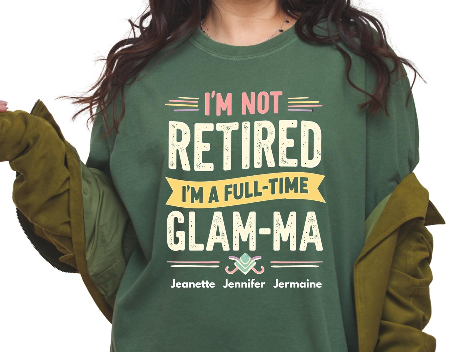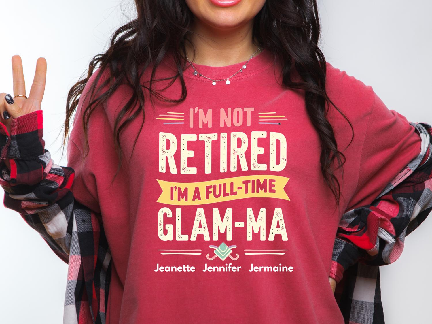 This Glam-Ma shirt is perfect for grandmas who proudly say, “I’m not retired I’m a full time Glam-Ma.” Mother Day gift Made for stylish, fun-loving grandmas who do it all, it’s a thoughtful Mother’s Day gift she’ll love showing off 🎁 The bold, playful design gives it a trendy everyday look that pairs effortlessly with jeans or leggings. Printed on a soft, comfortable graphic tee, it’s perfect for brunch dates, family gatherings, and celebrating her full-time Glam-Ma life 👕✨