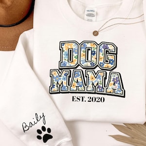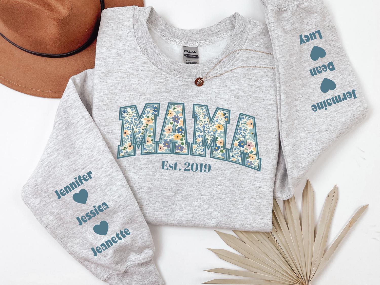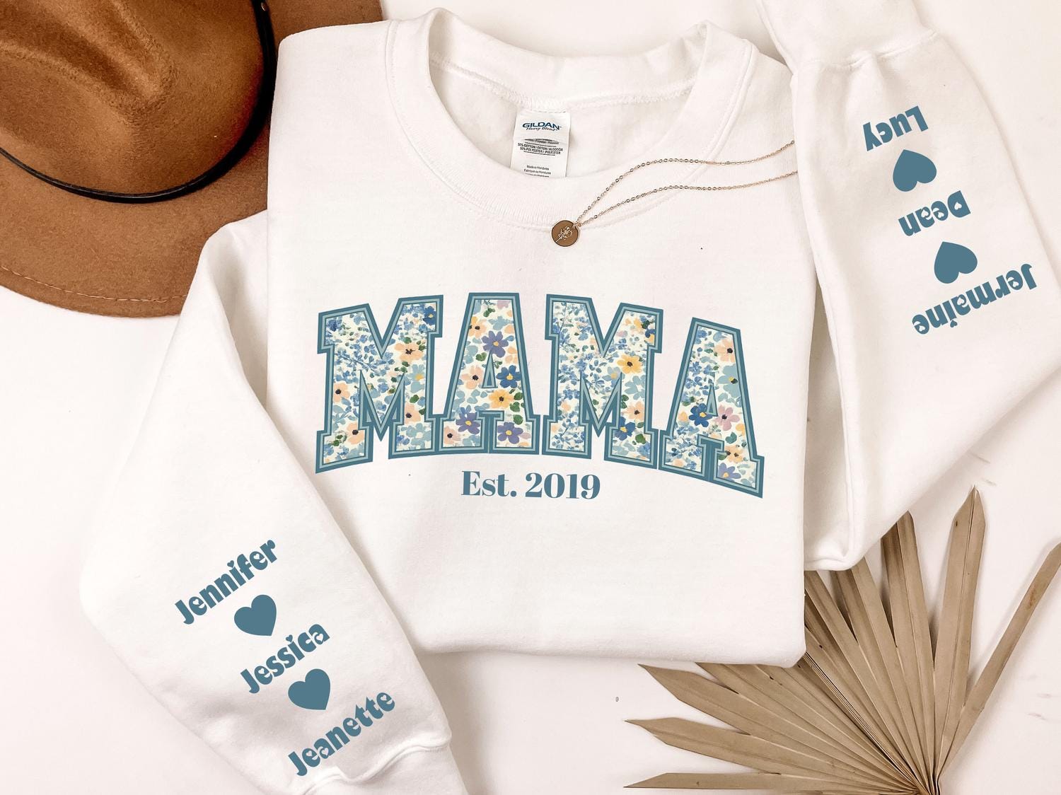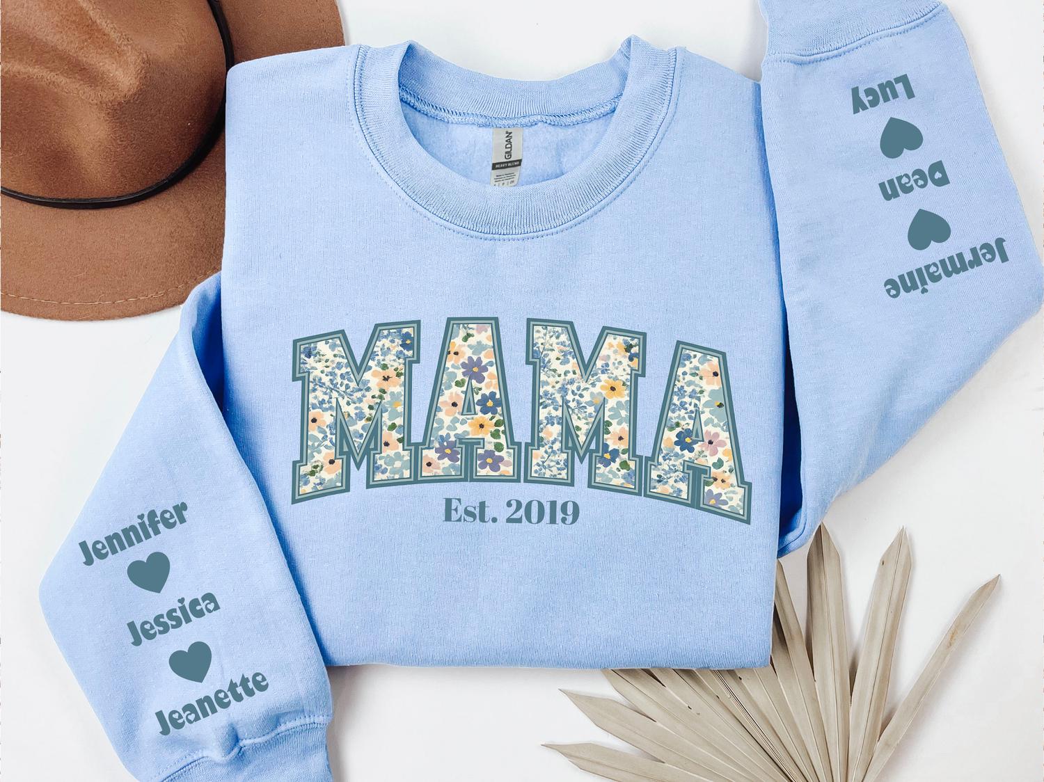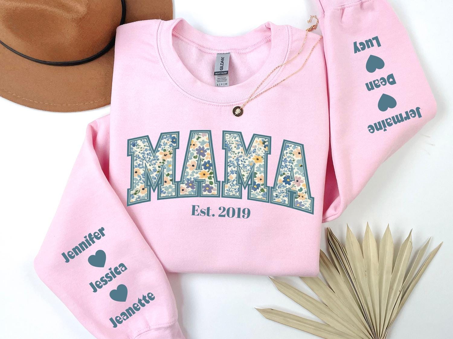 Personalized Mothers Day Gift Mama Est Year Sweatshirt Custom Name Sleeve Mama Shirt Floral Varsity Style Mom Crewneck Mothers Day Gift Idea