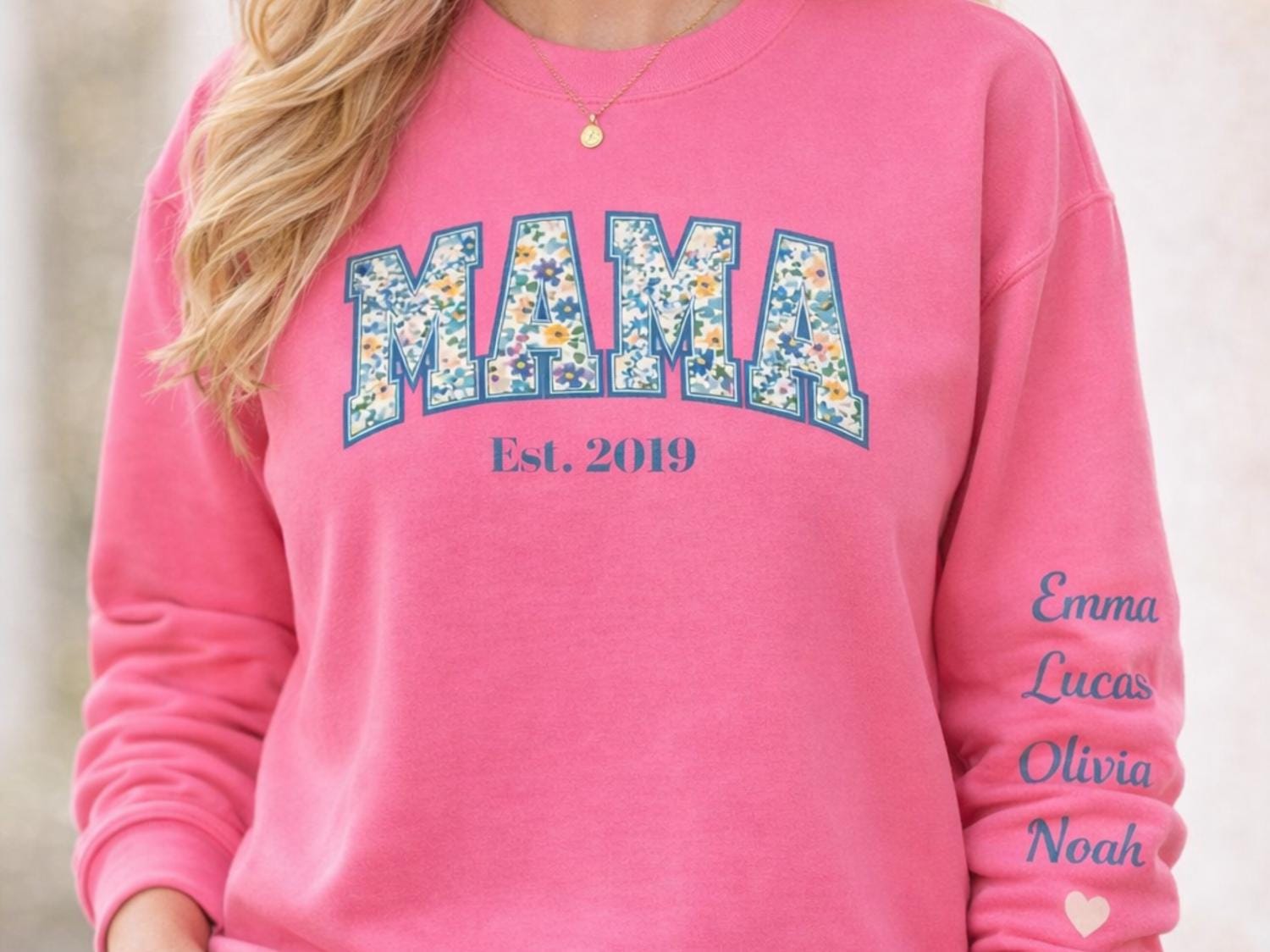 This Mama Est sweatshirt is a personalized floral mama crewneck designed for proud moms for Mothers Day, who wear their hearts on their sleeves. Featuring bold varsity-style “Mama” lettering with a soft blue floral fill and custom names printed down the sleeve, it’s the perfect Mothers Day gift or new mom gift. 💐 Add the year she became a mama and her children’s names for a meaningful everyday piece she’ll love wearing year-round. This cozy crewneck sweatshirt pairs effortlessly with jeans or leggings for comfortable, stylish everyday wear. 🎁 A thoughtful keepsake for Mothers Day, baby announcements, or just because. ❤️