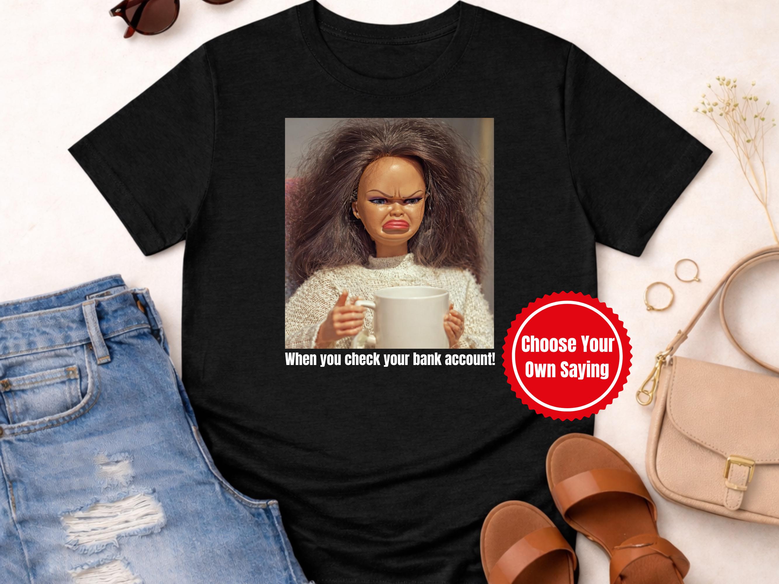 Add a bold, humorous touch to your wardrobe with our Personalized Doll Face Meme Shirt Disgusted Black Doll Face T-Shirt. This funny meme art tee features a striking black doll face with an expression of disgust, making it a perfect conversation starter and a fun statement piece for any casual occasion.