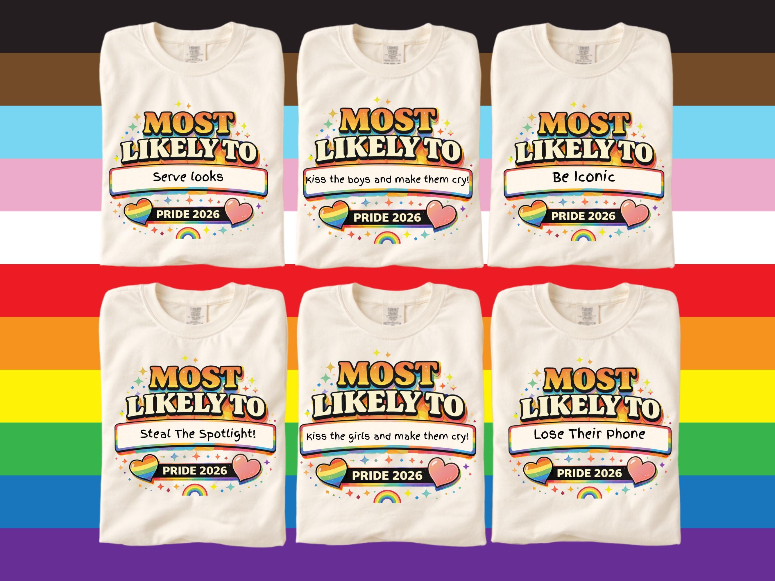 Custom Pride Group Shirts, Most Likely To Shirt, Pride Shirt Custom pride month shirts, Pride 2026 pride outfits pride flag lesbian pride
