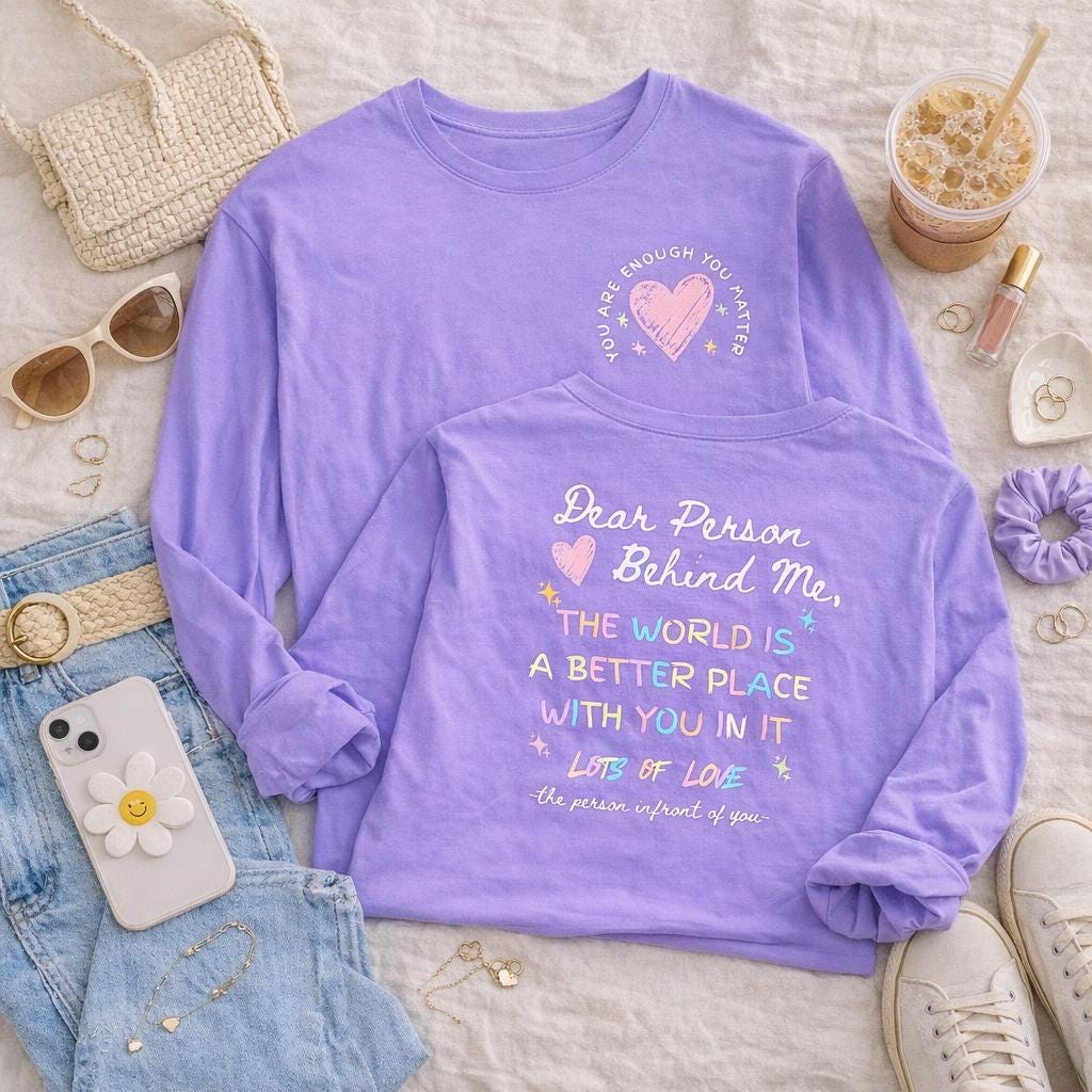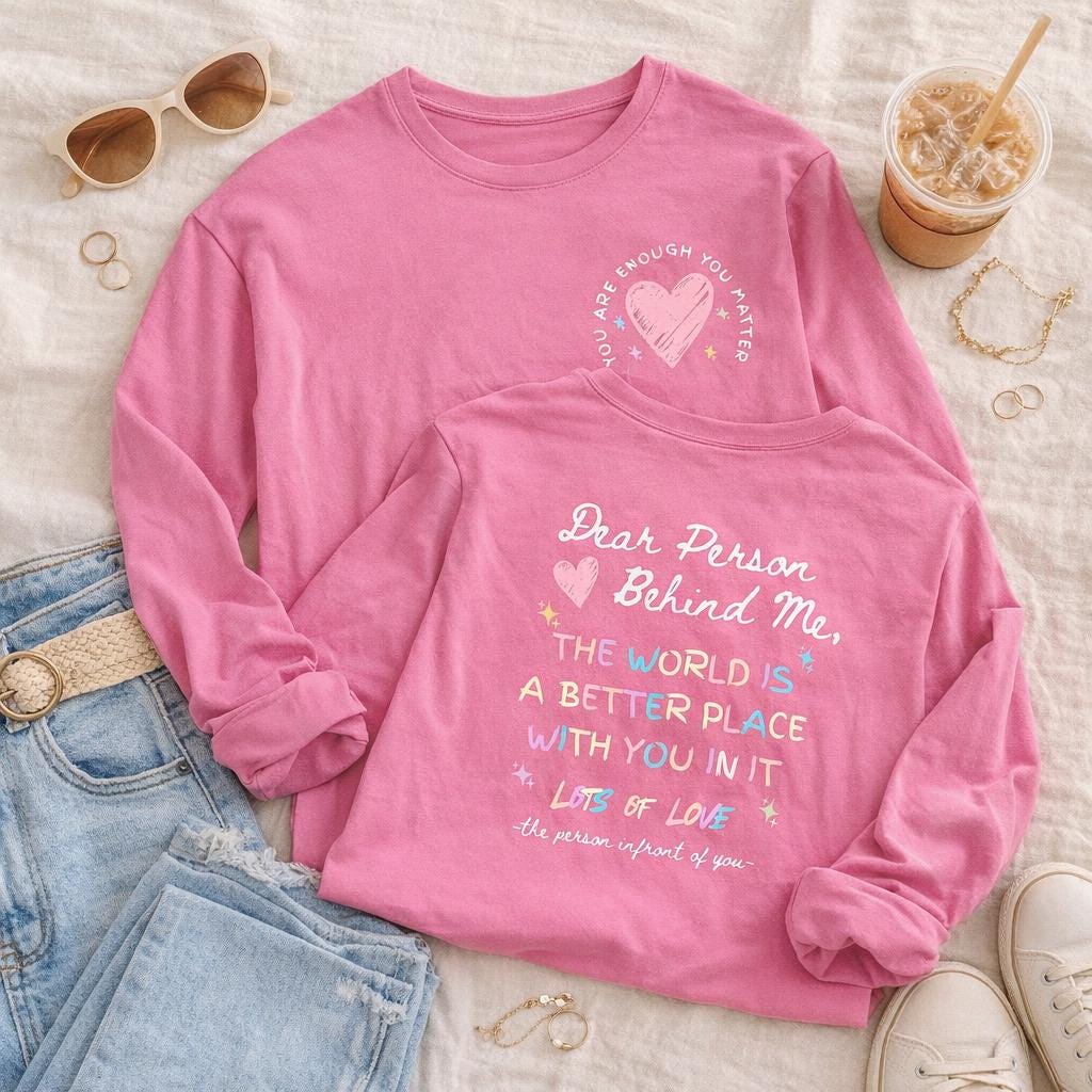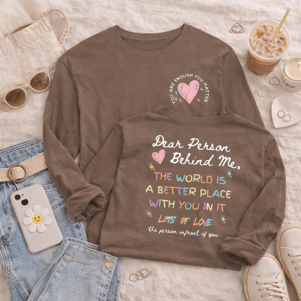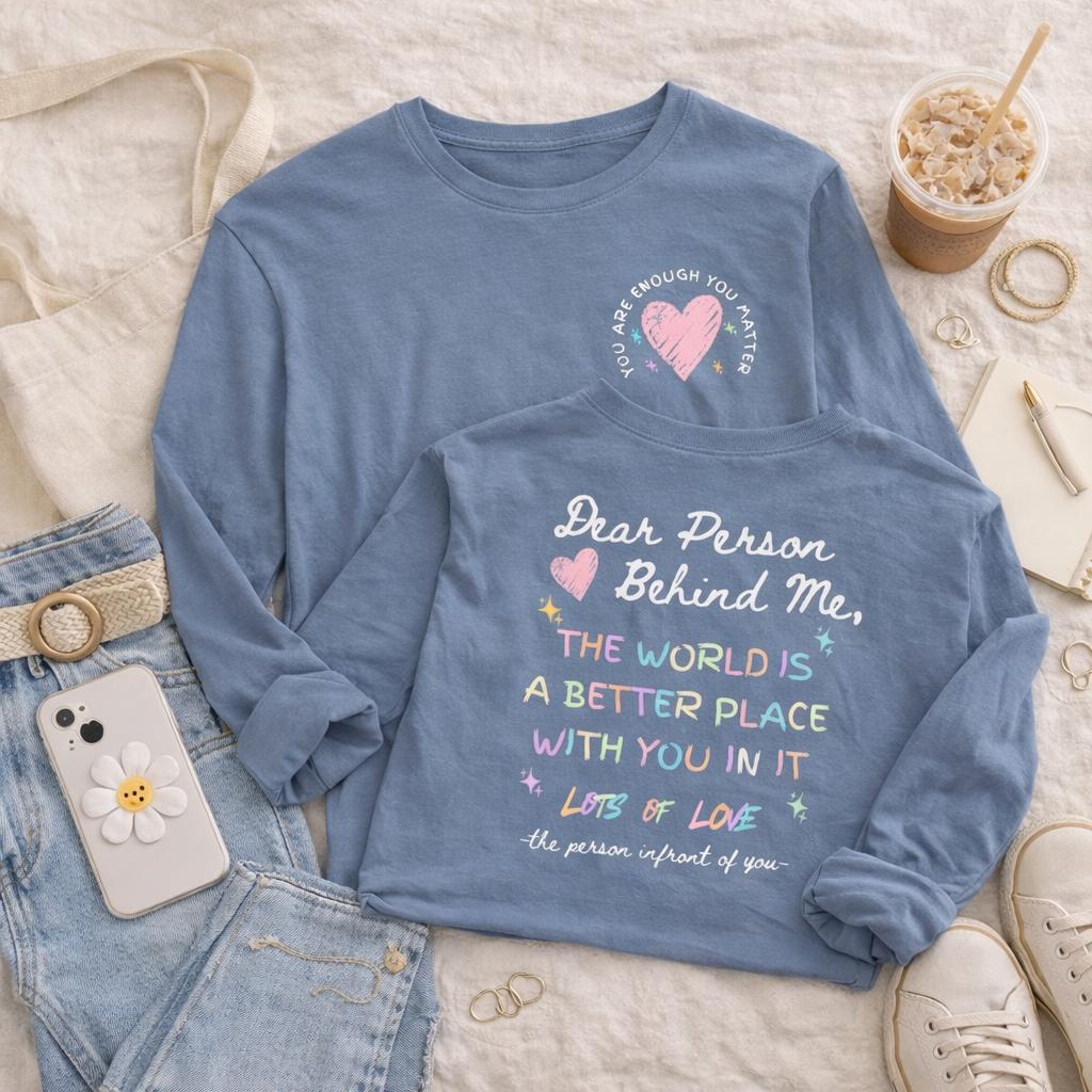 This inspirational Long sleeve shirt, Comfort Colors, “To the person behind me You are enough You matter.” Designed as a motivational tee that spreads kindness wherever you go, it’s perfect for anyone who wants to uplift others with a simple, meaningful reminder ❤️ The clean, aesthetic typography style makes it easy to pair with jeans, leggings, or cozy layers for everyday wear 👕 A thoughtful gift for friends, teens, coworkers, or anyone who values mental health awareness and positive affirmation, this shirt is ideal for birthdays, encouragement gifts, or just because 🎁 Comfortable and easy to wear, it’s a simple way to turn an ordinary day into something encouraging and impactful.