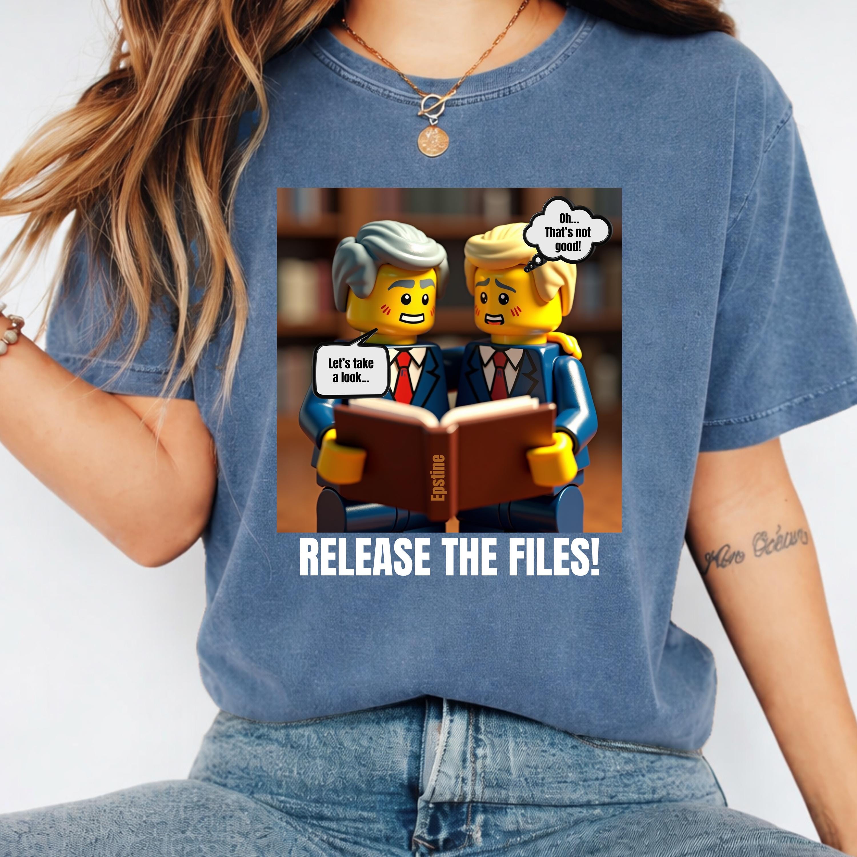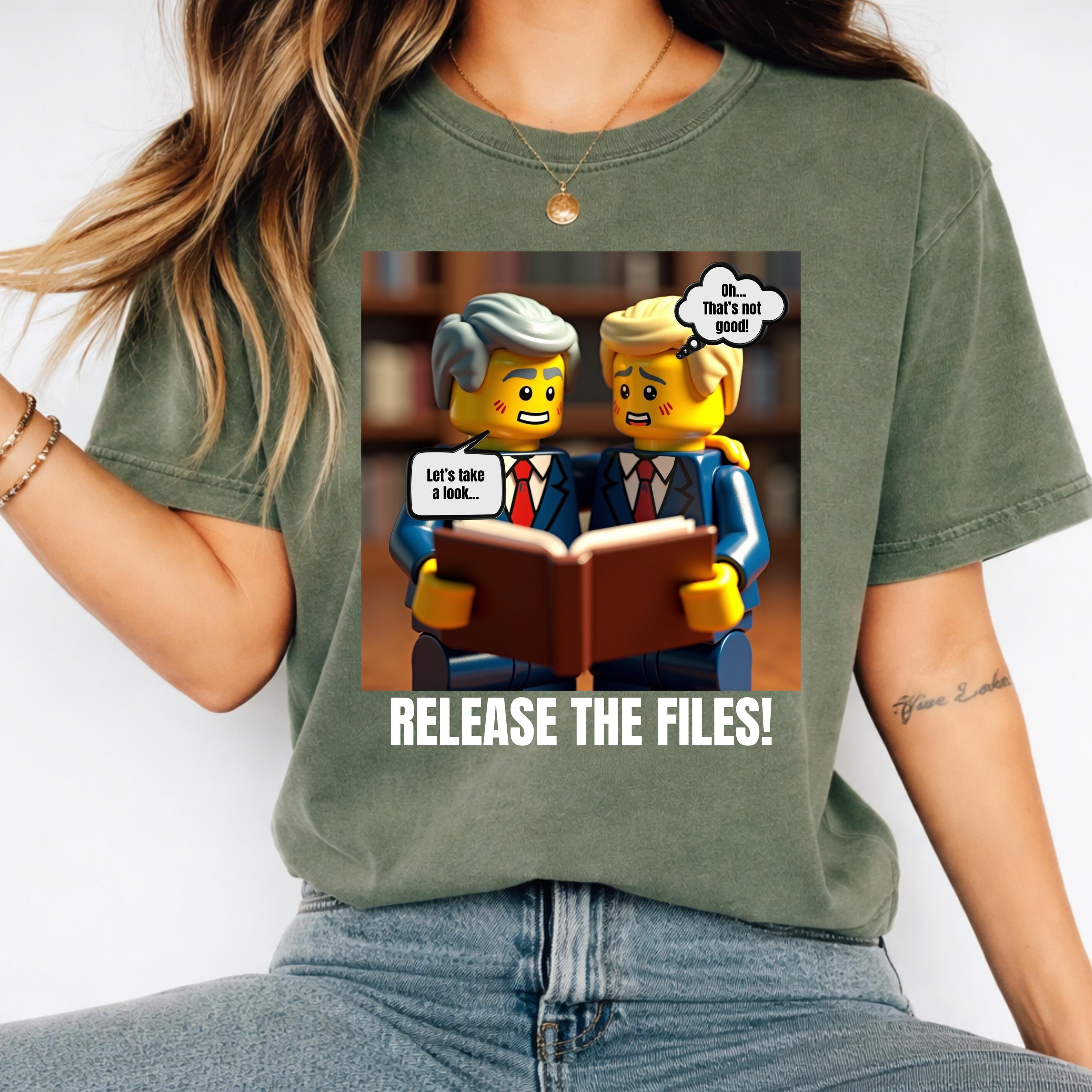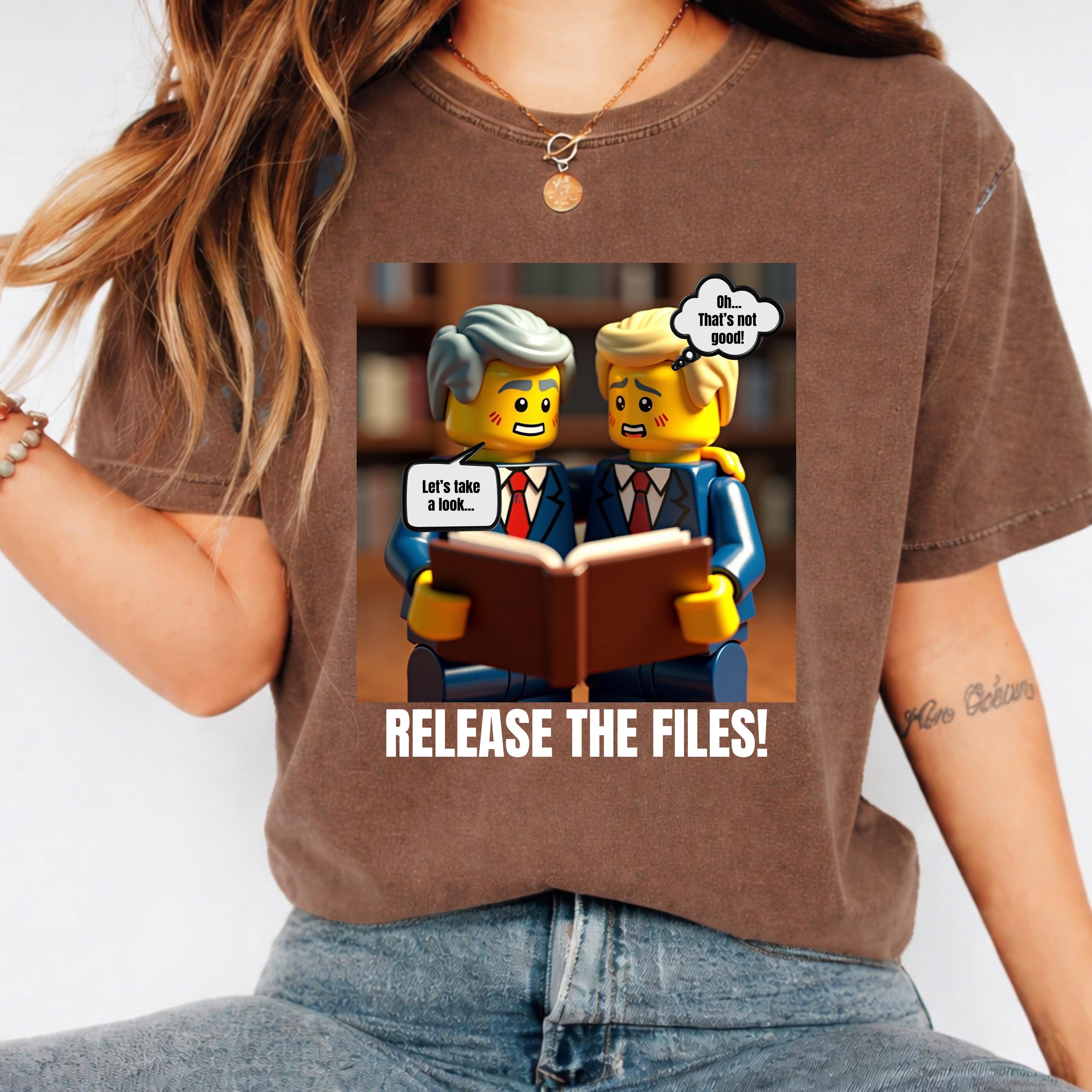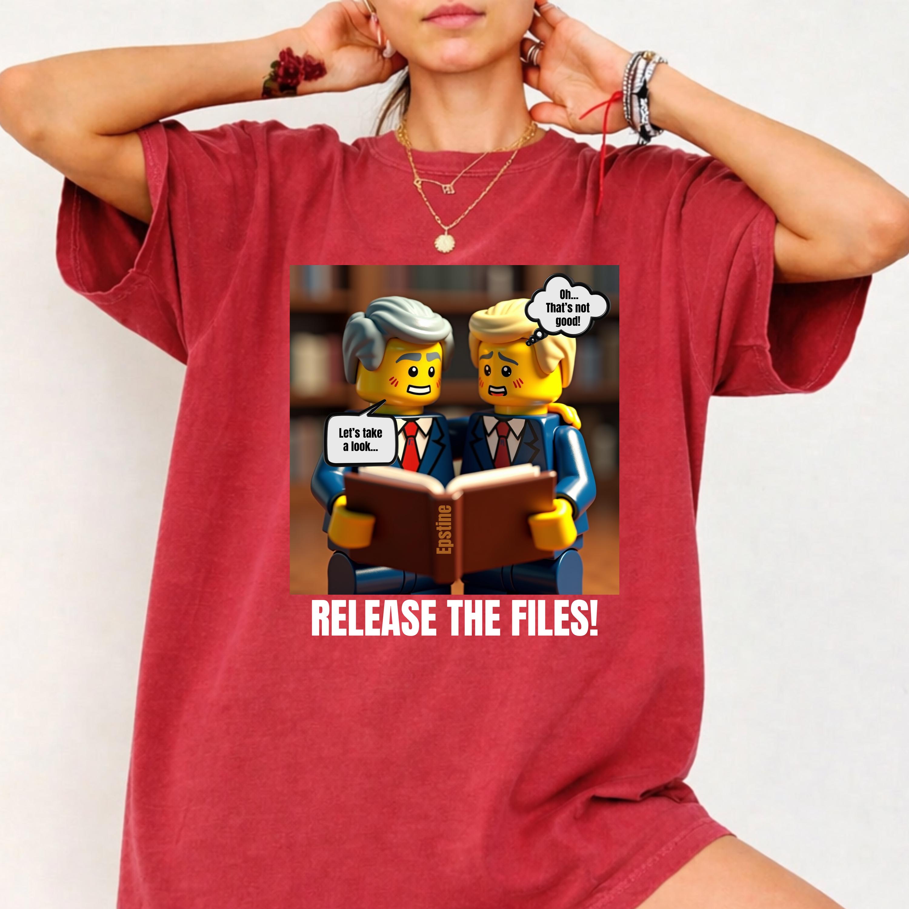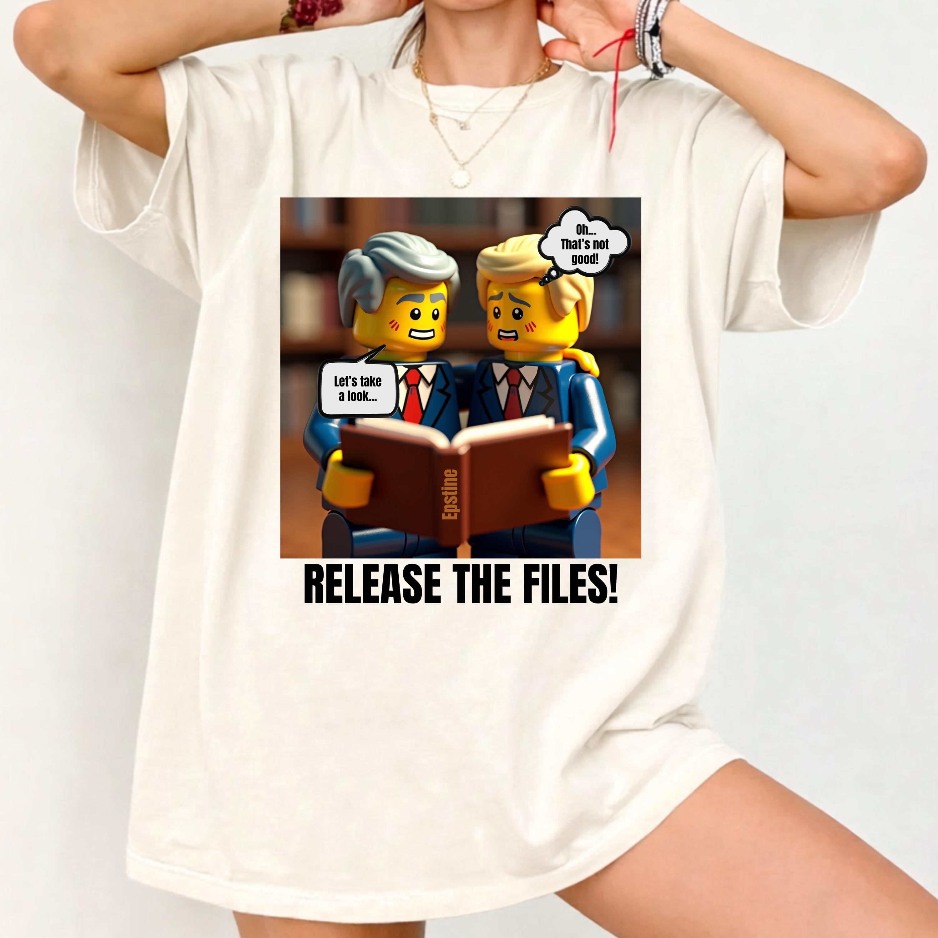 The eye-catching graphic depicts Lego-style figures with witty speech bubbles and the bold message "RELEASE THE FILES!"—a clever, humorous way to express your political stance. Whether you're protesting, attending a rally, or just want to showcase your social justice values, this trending anti Trump T-shirt is a versatile addition to your wardrobe.