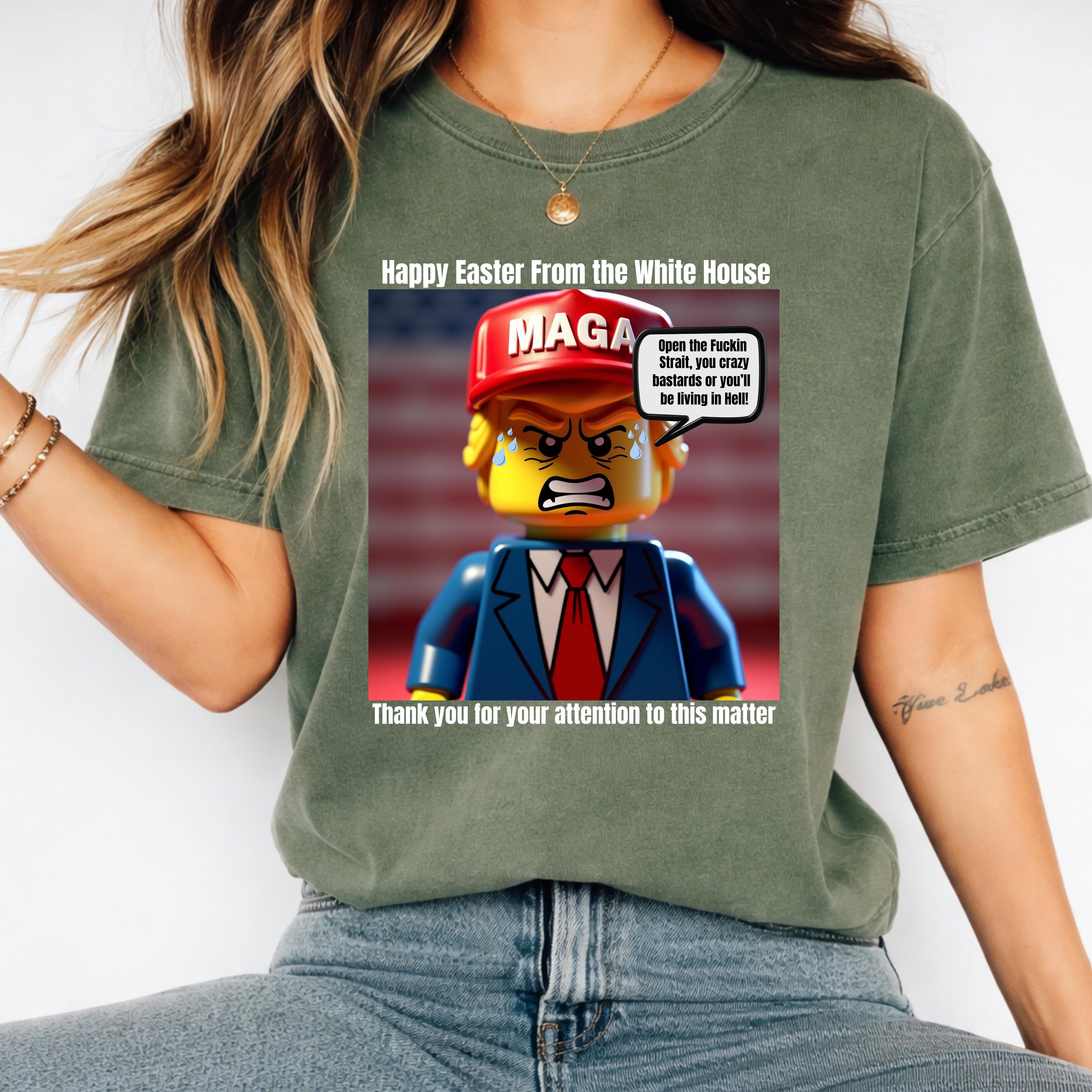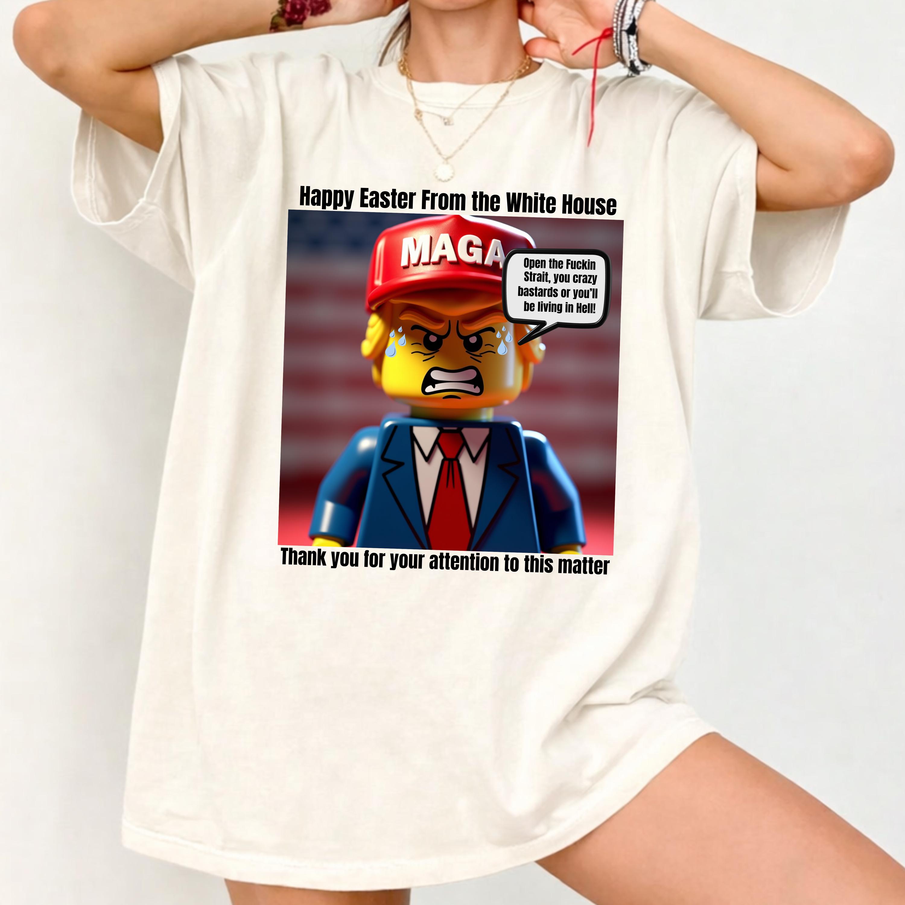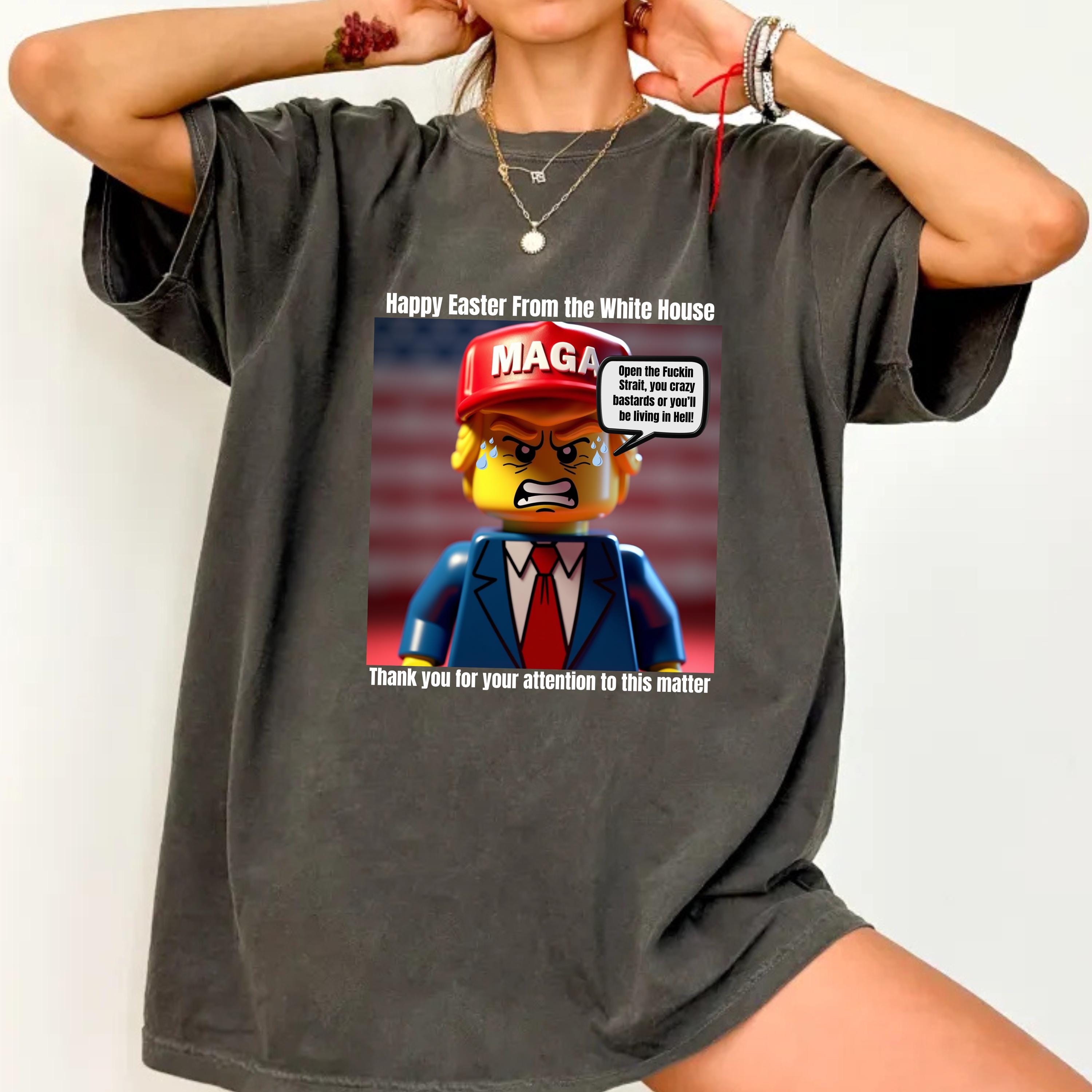 The eye-catching graphic features a humorous LEGO-style caricature with a speech bubble, making it a fun yet powerful way to express your political stance. Available in 8 colors, you can choose the perfect shade to match your style.