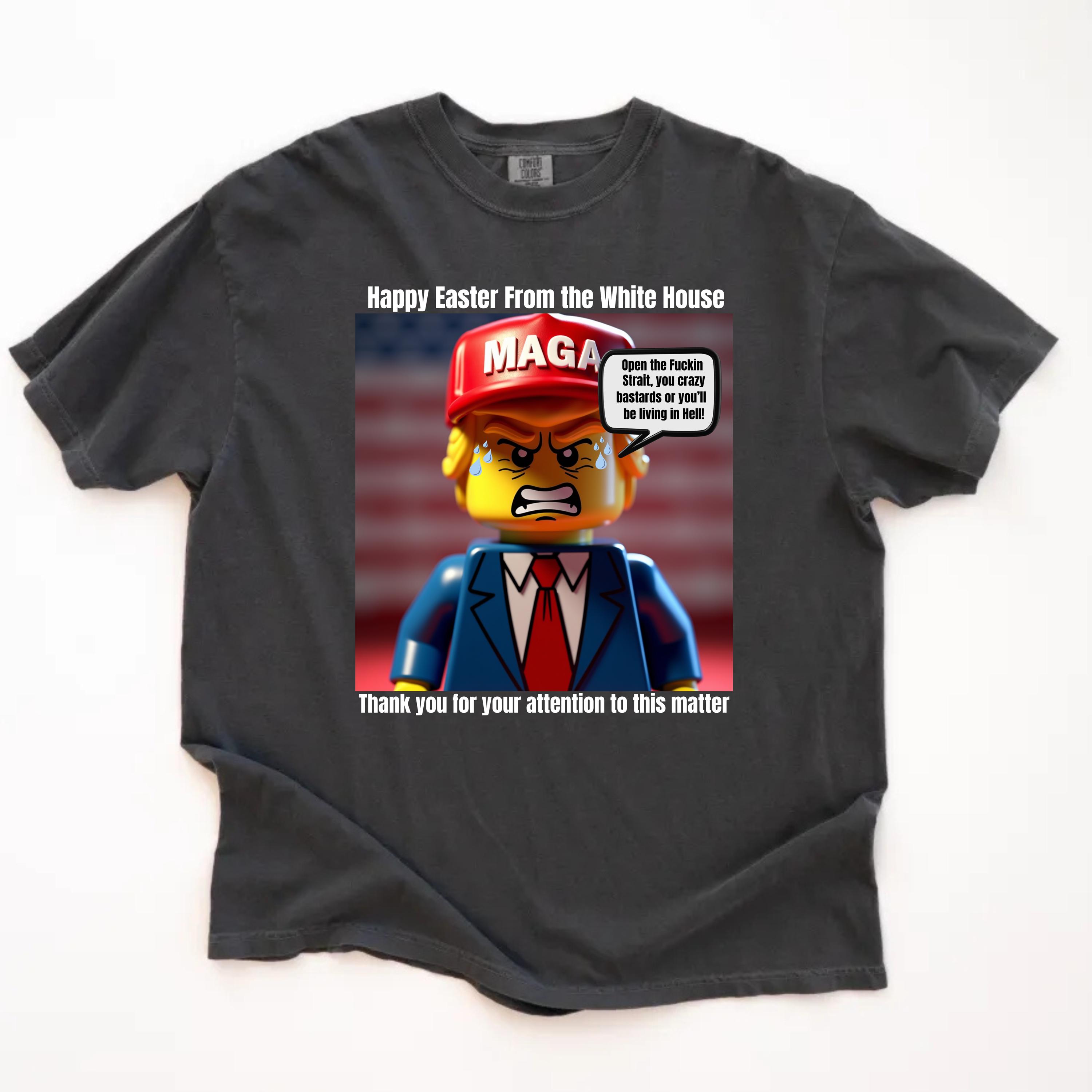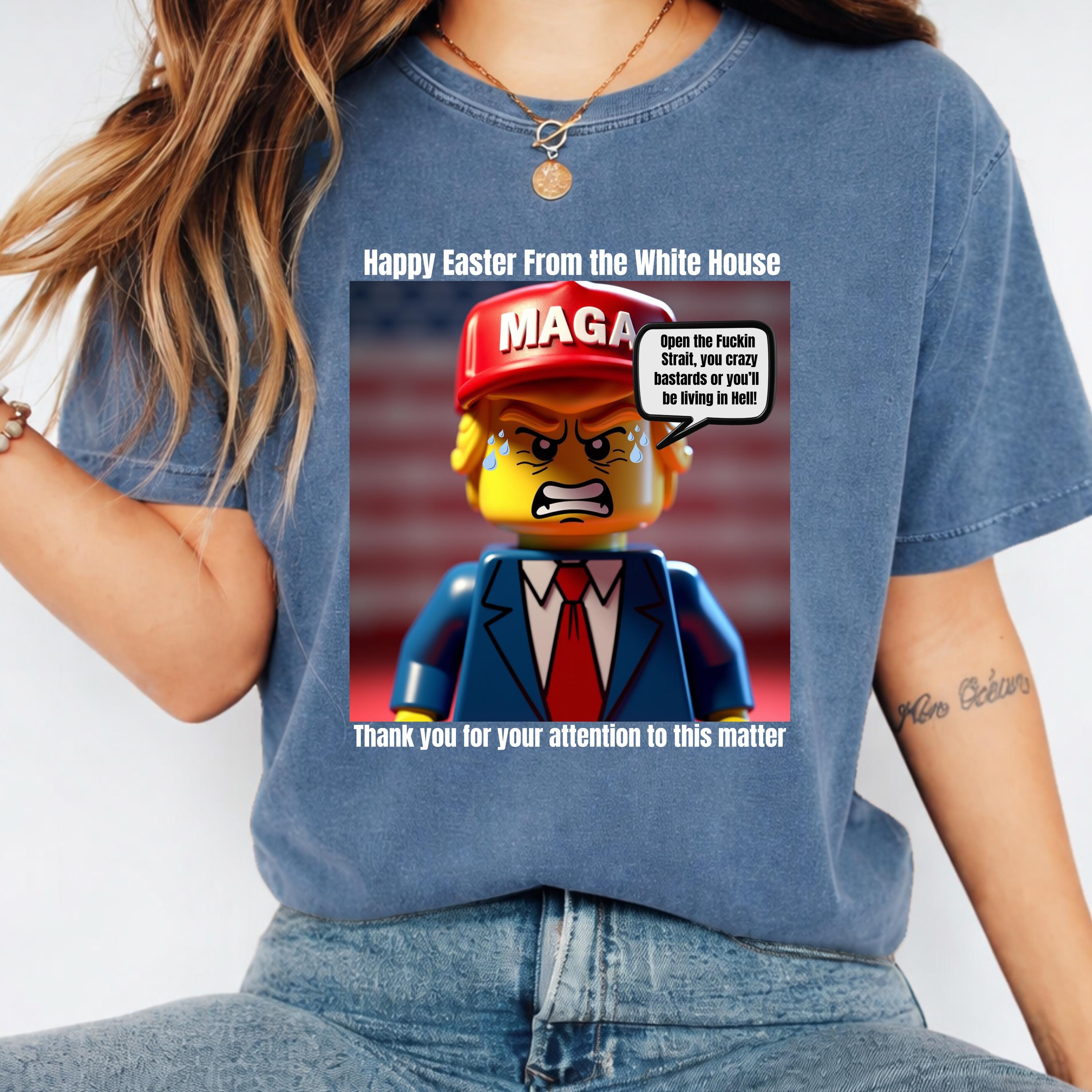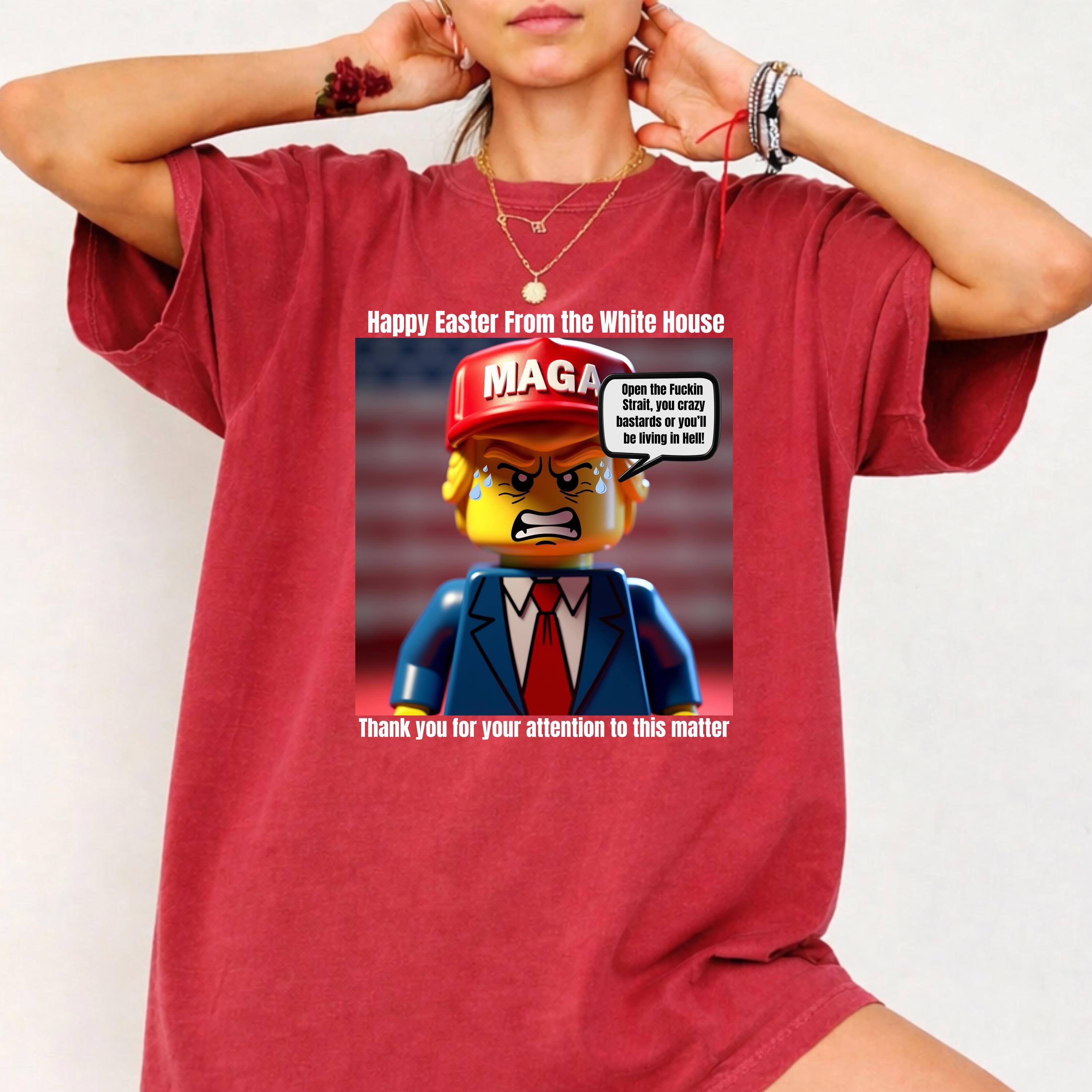 The eye-catching graphic features a humorous LEGO-style caricature with a speech bubble, making it a fun yet powerful way to express your political stance. Available in 8 colors, you can choose the perfect shade to match your style.