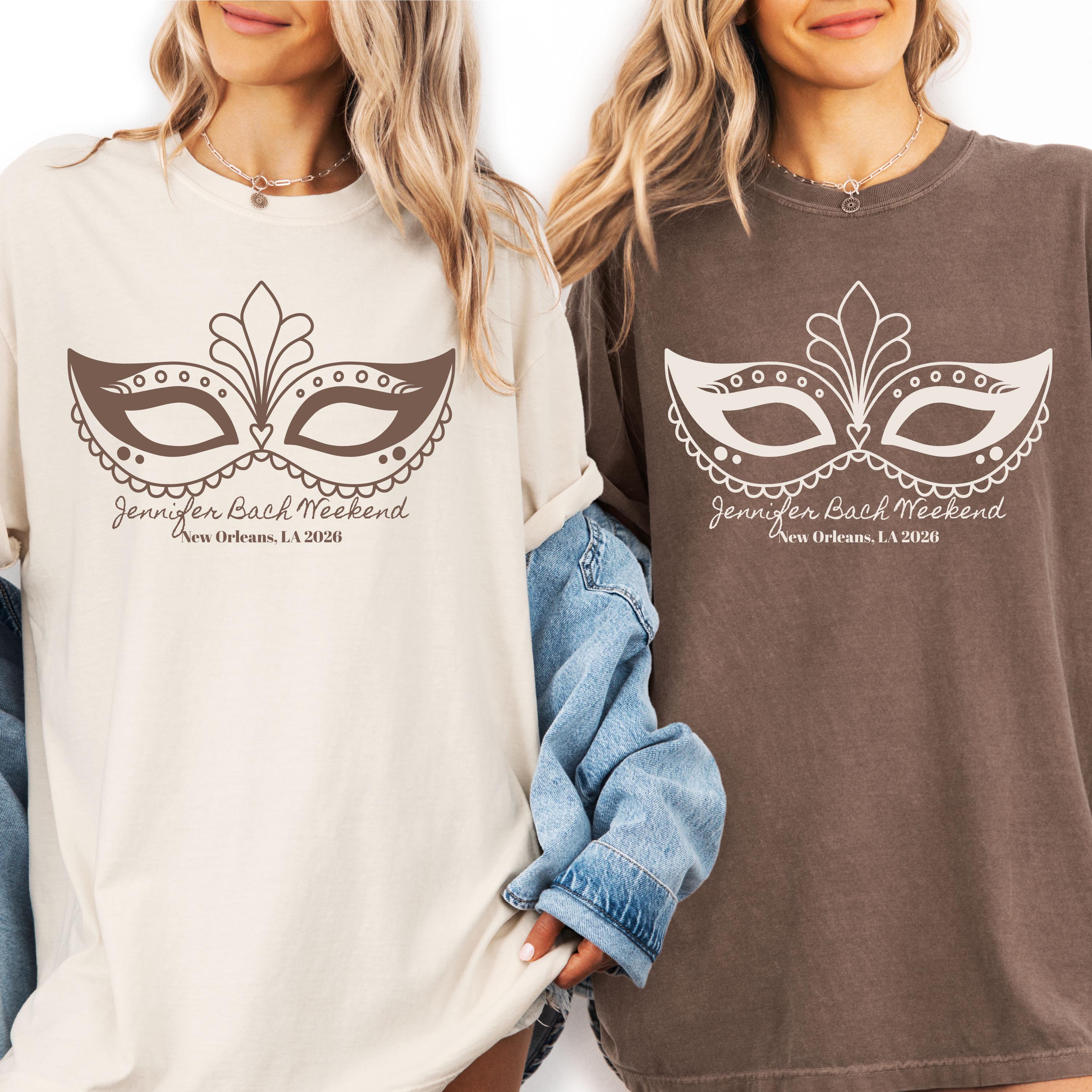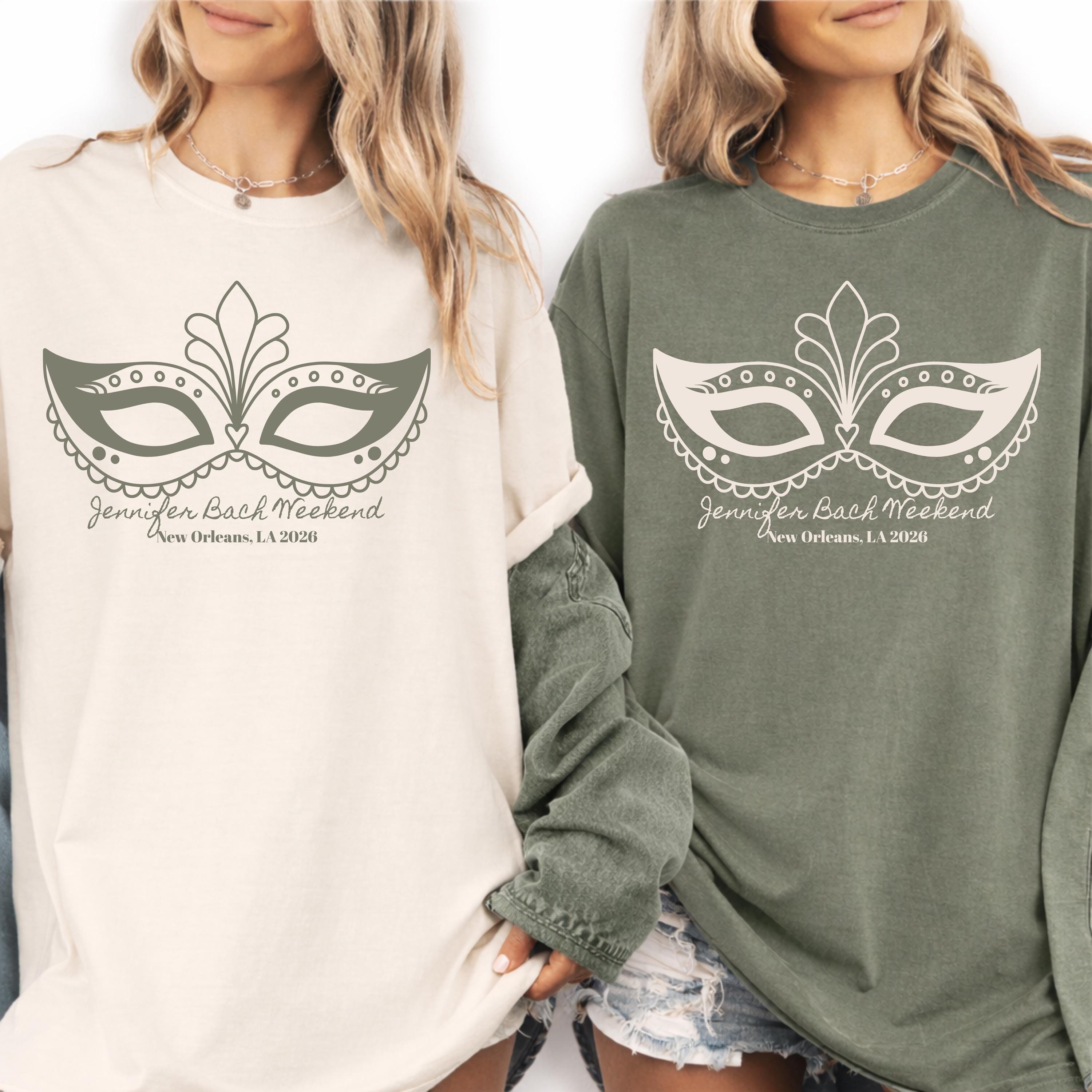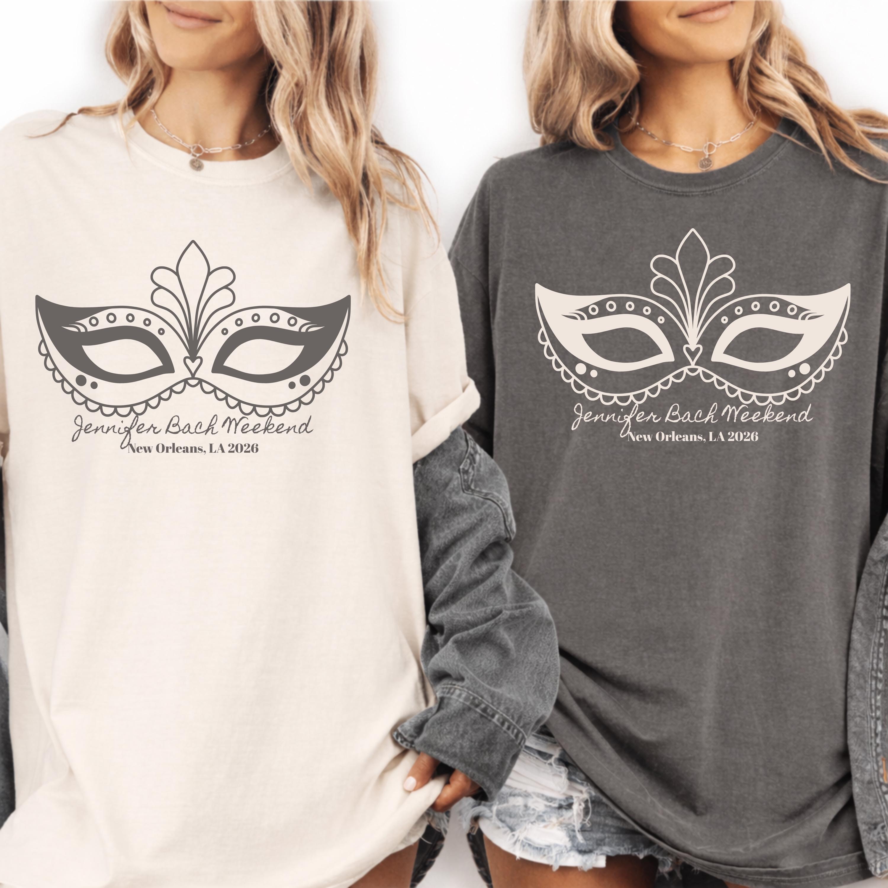 New Orleans Bachelorette Shirts custom NOLA bach weekend tees, Mardi Gras mask bride squad shirts, personalized bridal girls trip shirts