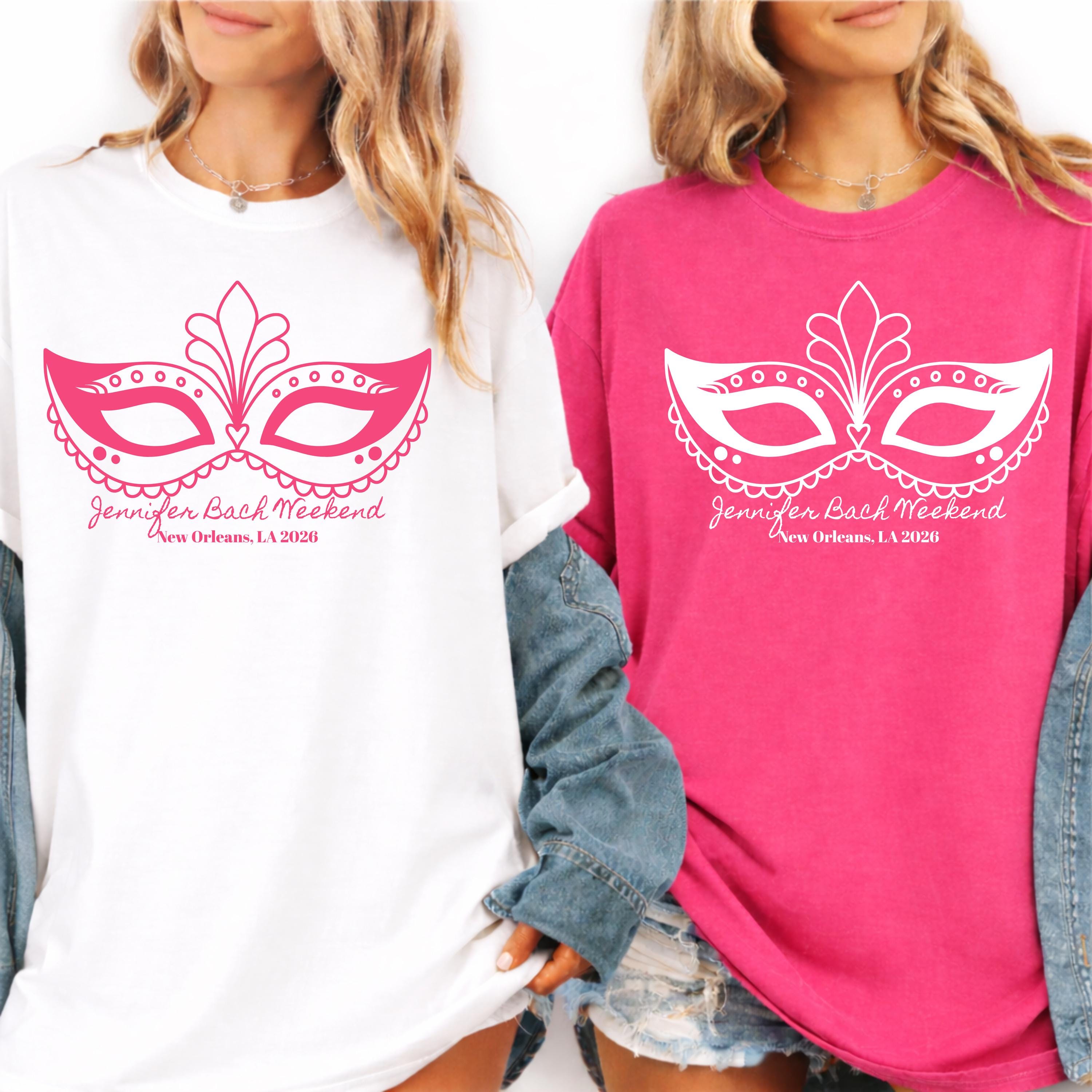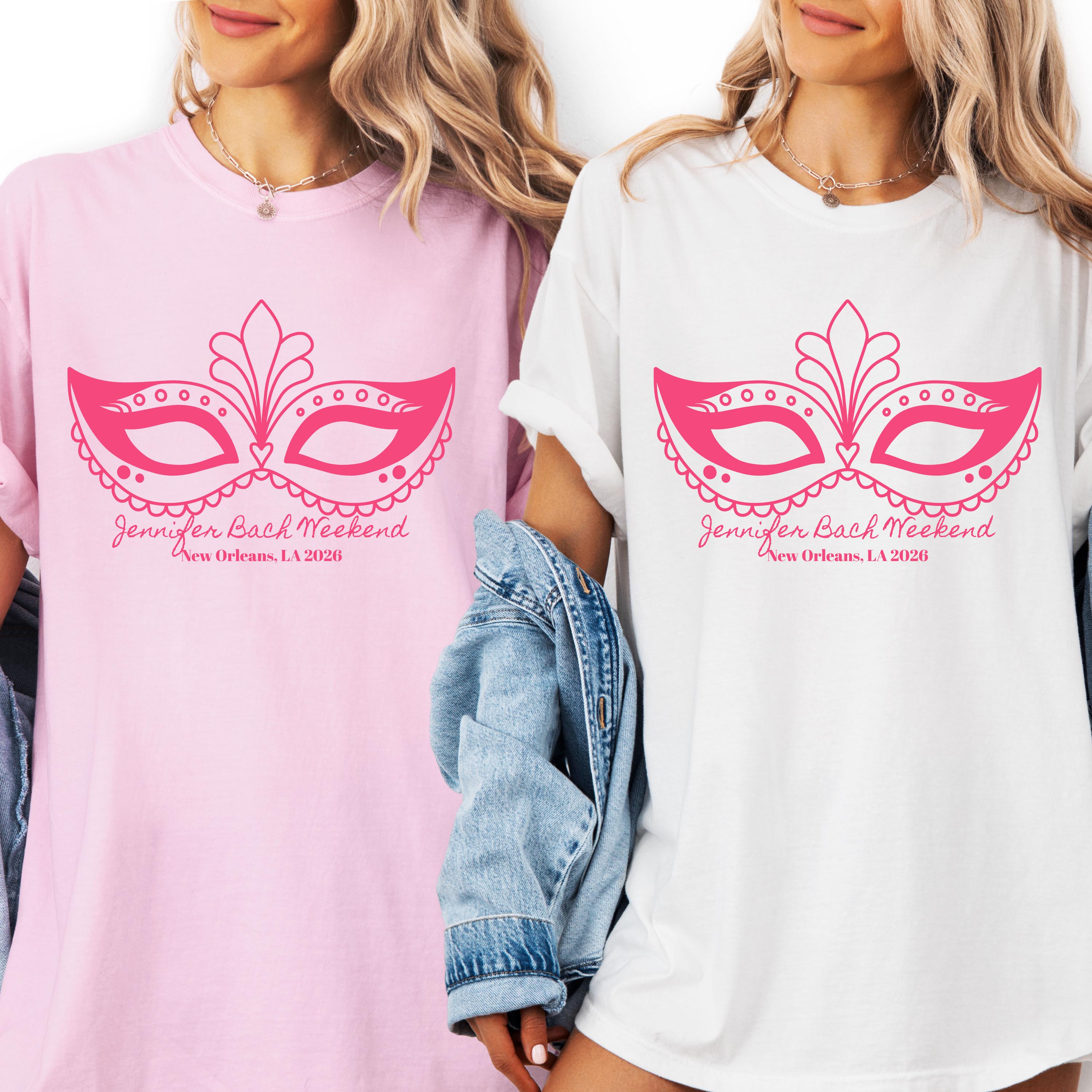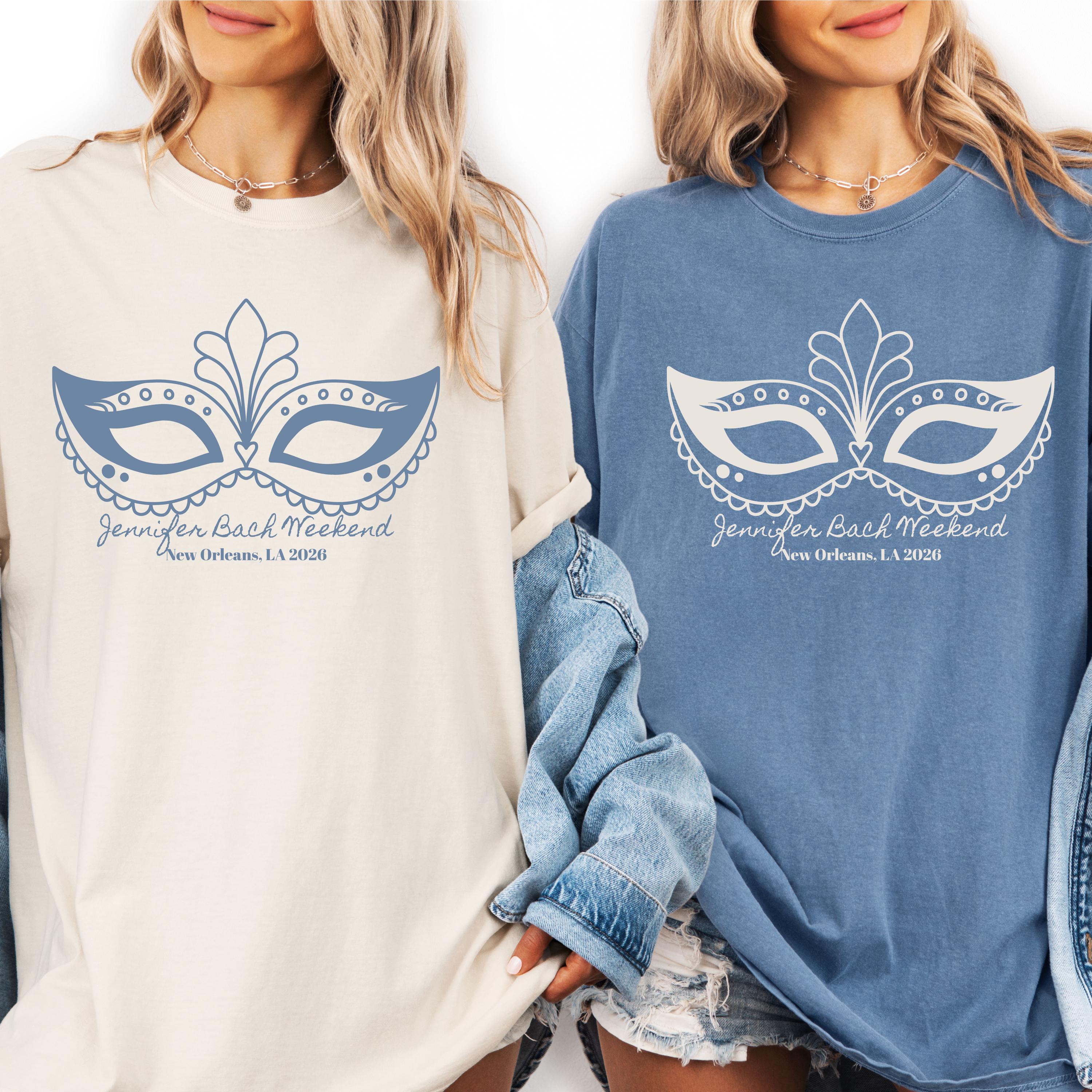 New Orleans Bachelorette Shirts custom NOLA bach weekend tees, Mardi Gras mask bride squad shirts, personalized bridal girls trip shirts